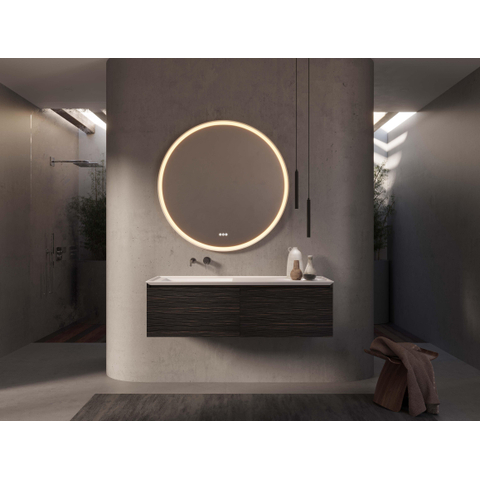 Le meuble sous lavabo Thebalux Set Tresor rayonne de luxe dans chaque aspect de son design. Avec un placage en biais à 45 degrés en Acrylique Italian Alpi Relief, ce meuble ajoute une touche d'élégance à votre salle de bain. Le compartiment de tiroir en verre sans poignée et le lavabo de CORIAN blanc pur créent une apparence moderne et sans joint qui transforme votre salle de bain en un espace chic.