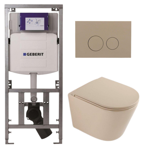 QeramiQ Dely Pack WC - 36.3x51.7cm - à fond creux - sans bride - réservoir attenant Geberit UP320 - abattant WC à fermeture douce - plaque de commande taupe - boutons ronds - mat beige