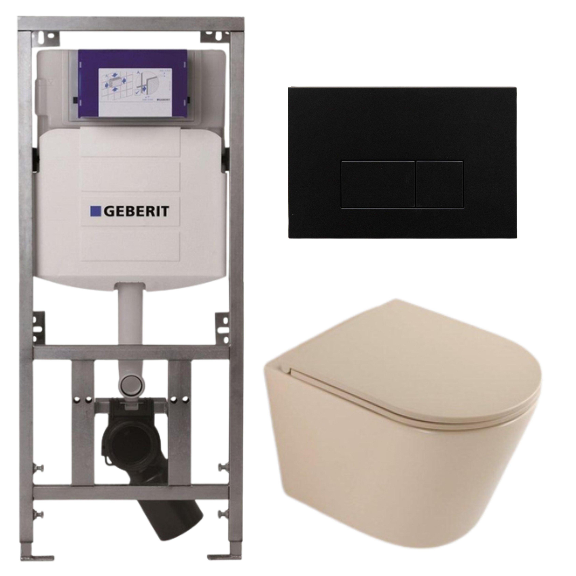 QeramiQ Dely Pack WC - 36,3x51,7cm - à fond creux - sans bride - réservoir encastré Geberit UP320 - abattant WC à fermeture douce - plaque de déclenchement en métal noir mat - boutons rectangulaires - beige mat