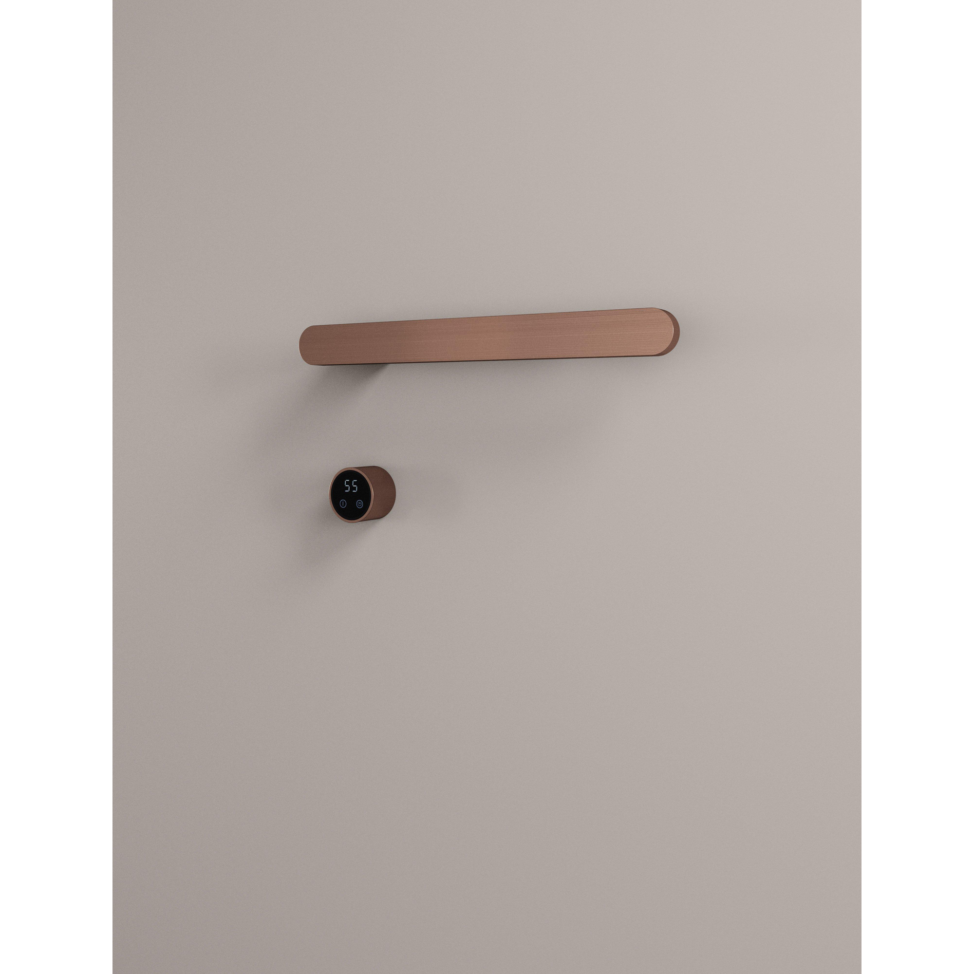 Ce radiateur porte-serviettes électrique compact est idéal si vous recherchez une solution à la fois élégante et fonctionnelle pour sécher rapidement vos serviettes et les chauffer agréablement, sans devoir installer un grand radiateur au mur. Grâce au design horizontal avec une barre robuste, il trouve parfaitement sa place à côté du lavabo, près des toilettes ou dans une douche à l’italienne minimaliste. La finition luxueuse couleur cuivre apporte immédiatement chaleur et atmosphère aux salles de bains modernes, industrielles et de style hôtel chic, mais elle s’intègre aussi très bien dans les petits espaces ou une deuxième salle de bains. Grâce à l’interrupteur intégré, vous le commandez facilement lorsque vous avez besoin de chaleur, ce qui vous permet de gérer l’énergie de manière responsable. Vous bénéficiez ainsi, avec un produit relativement petit, d’une grande différence de confort dans votre routine quotidienne dans la salle de bains.