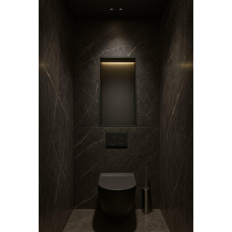 La finition PVD noire brossée confère à cette niche encastrée un aspect contemporain et raffiné qui s'harmonise facilement avec différents styles de salle de bain. La surface noire mate subtile offre une sensation de luxe sans dominer, ce qui en fait un complément parfait pour les intérieurs modernes et industriels. L'éclairage LED intégré ajoute non seulement de l'ambiance, mais met également en valeur le contenu de la niche de manière élégante. Vous créez ainsi un point visuel fort qui donne à votre salle de bain une apparence unique.