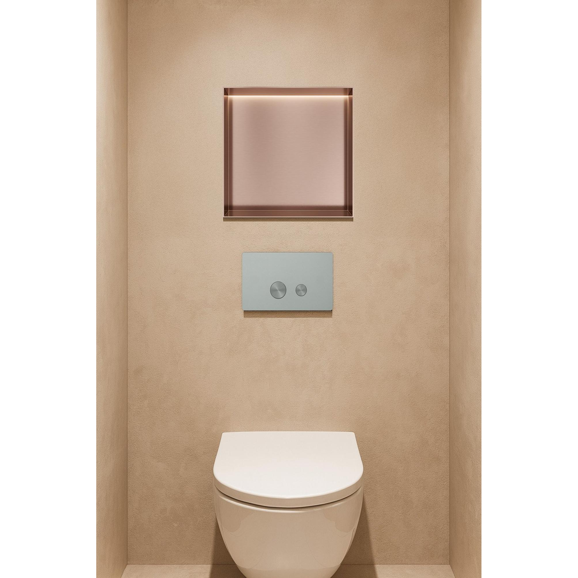 La forme sans cadre et la surface en cuivre brossé font de cette niche encastrée un véritable point focal. L'accent subtil en cuivre ajoute chaleur et caractère à votre salle de bains, tandis que l'apparence minimaliste assure une élégance intemporelle. Grâce à l'éclairage LED, le cuivre est magnifiquement mis en valeur et un jeu de lumière atmosphérique se crée. Cela fait de la niche non seulement un espace de rangement pratique, mais aussi un élément de design élégant qui améliore immédiatement votre salle de bains.