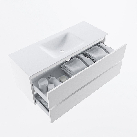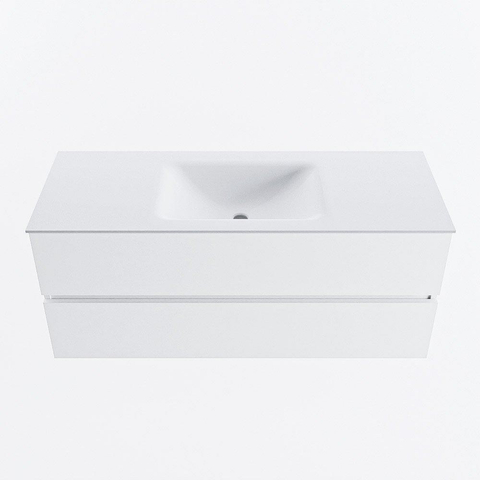 MONDIAZ VICA meuble sous lavabo 120cm Talc 2 tiroirs. Lavabo CLOUD central sans trou de robinet, couleur Talc.