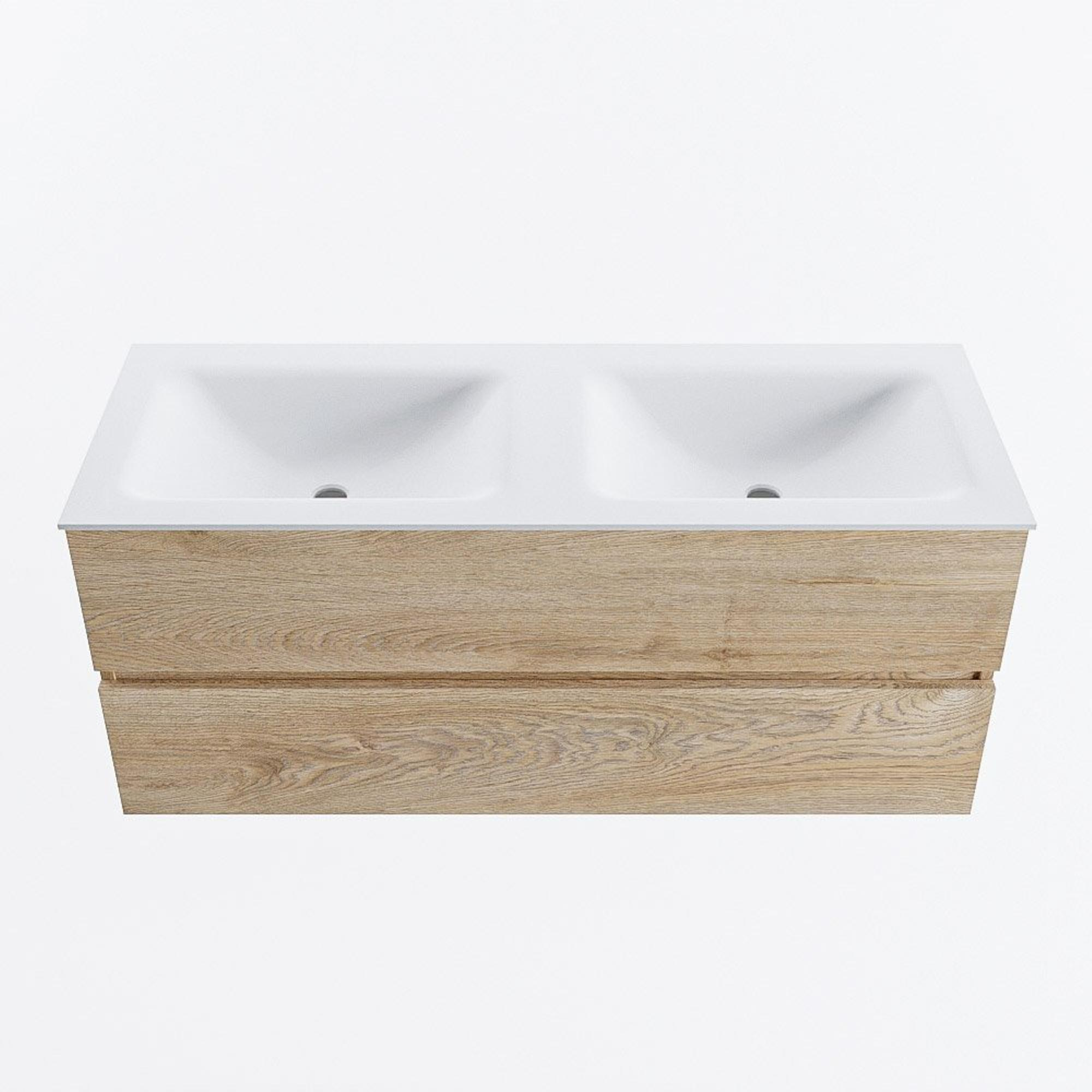 MONDIAZ VICA meuble sous lavabo 120cm Chêne blanchi 2 tiroirs. Lavabo CLOUD double sans trou de robinet, couleur Talc.