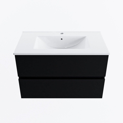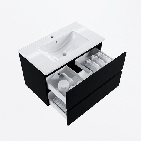 MONDIAZ VICA meuble sous lavabo 80cm Urban 2 tiroirs. Lavabo DENIA centre 1 trou de robinet, couleur Blanc Brillant.