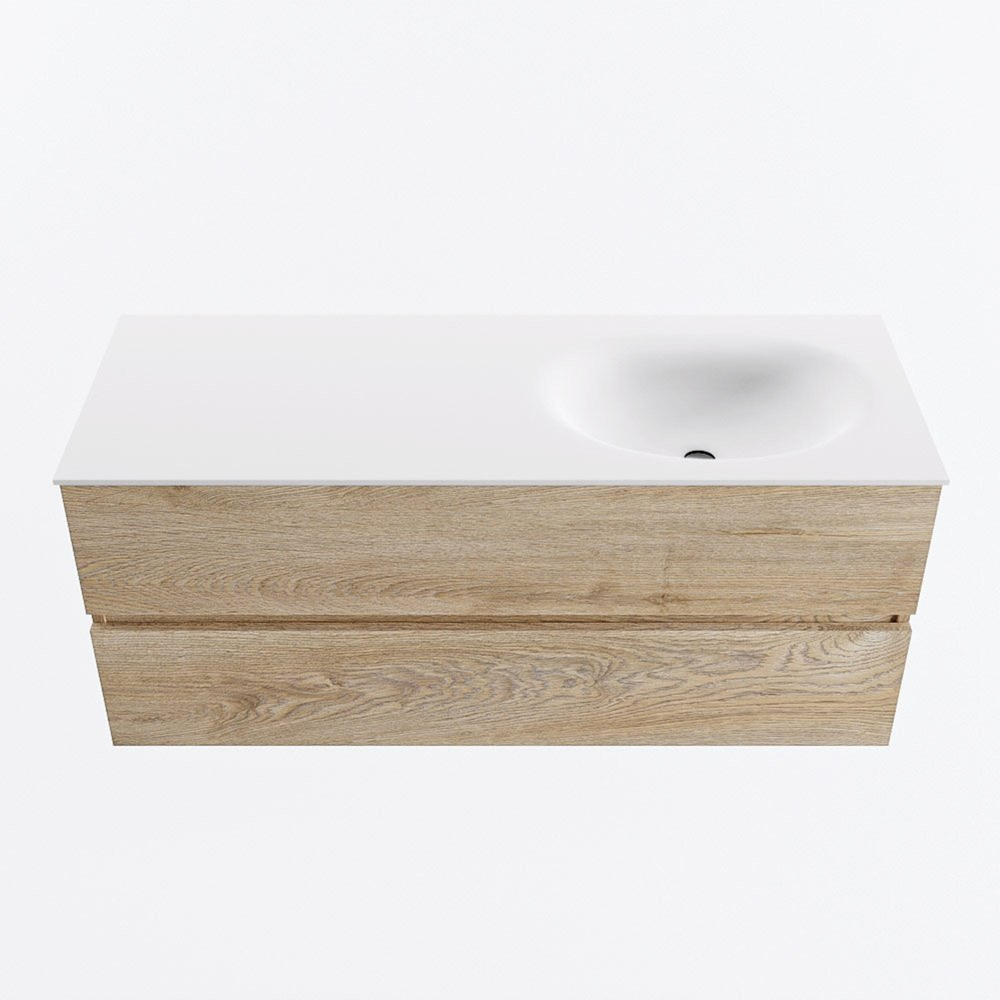 MONDIAZ VICA meuble sous lavabo 120cm Chêne blanchi 2 tiroirs. Lavabo MOON à droite sans trou de robinet, couleur Talc.