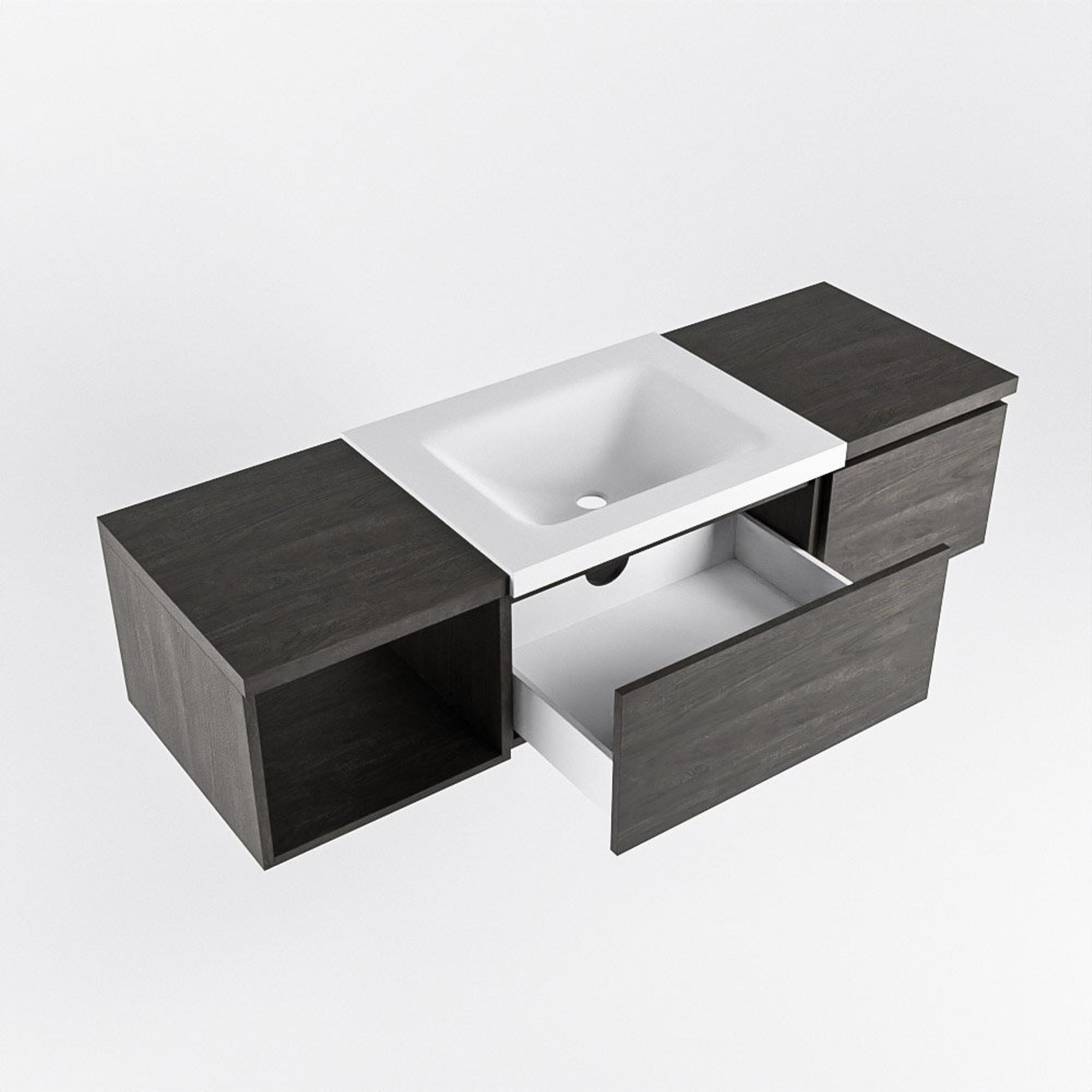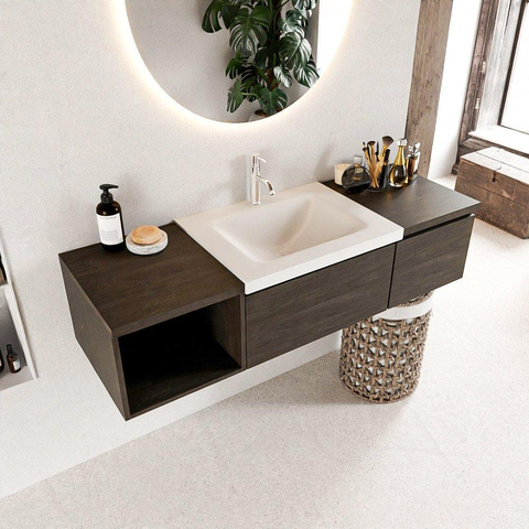 MONDIAZ BUKLA meuble de salle de bain 140cm avec module ouvert 40 à gauche couleur Marron Foncé avec 2 tiroirs. Lavabo CLOUD centre 1 trou de robinet couleur Talc.