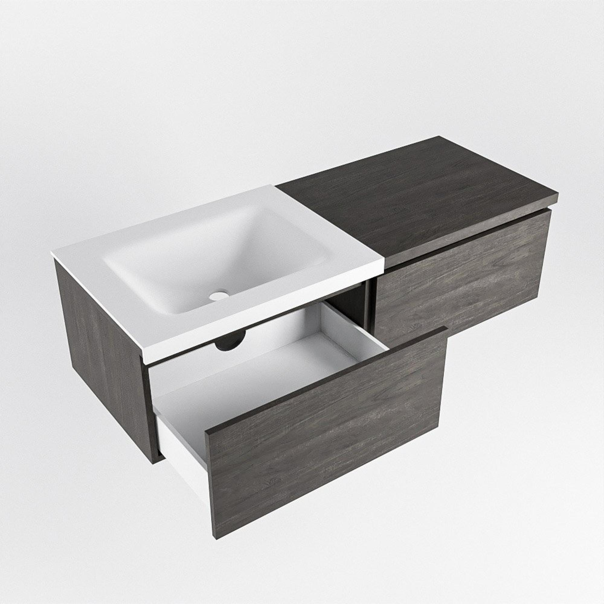 Ce meuble de salle de bain respire le luxe à chaque centimètre. La couleur Marron Foncé donne une apparence chaleureuse et accueillante à la salle de bain, tandis que les 2 tiroirs offrent suffisamment d'espace de rangement pour tous vos articles de toilette. Le lavabo CLOUD à gauche avec 1 trou de robinet en couleur Talc ajoute une touche d'élégance à l'ensemble, donnant à votre salle de bain une allure chic.
