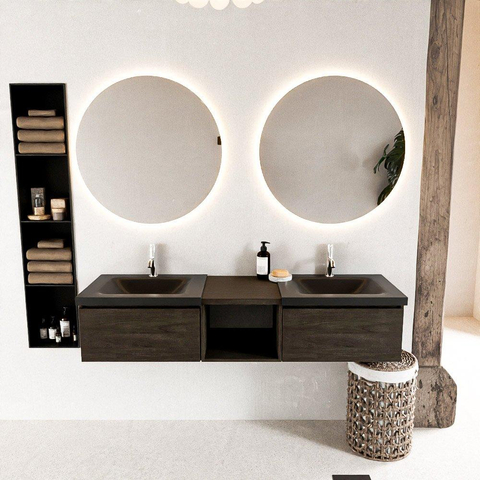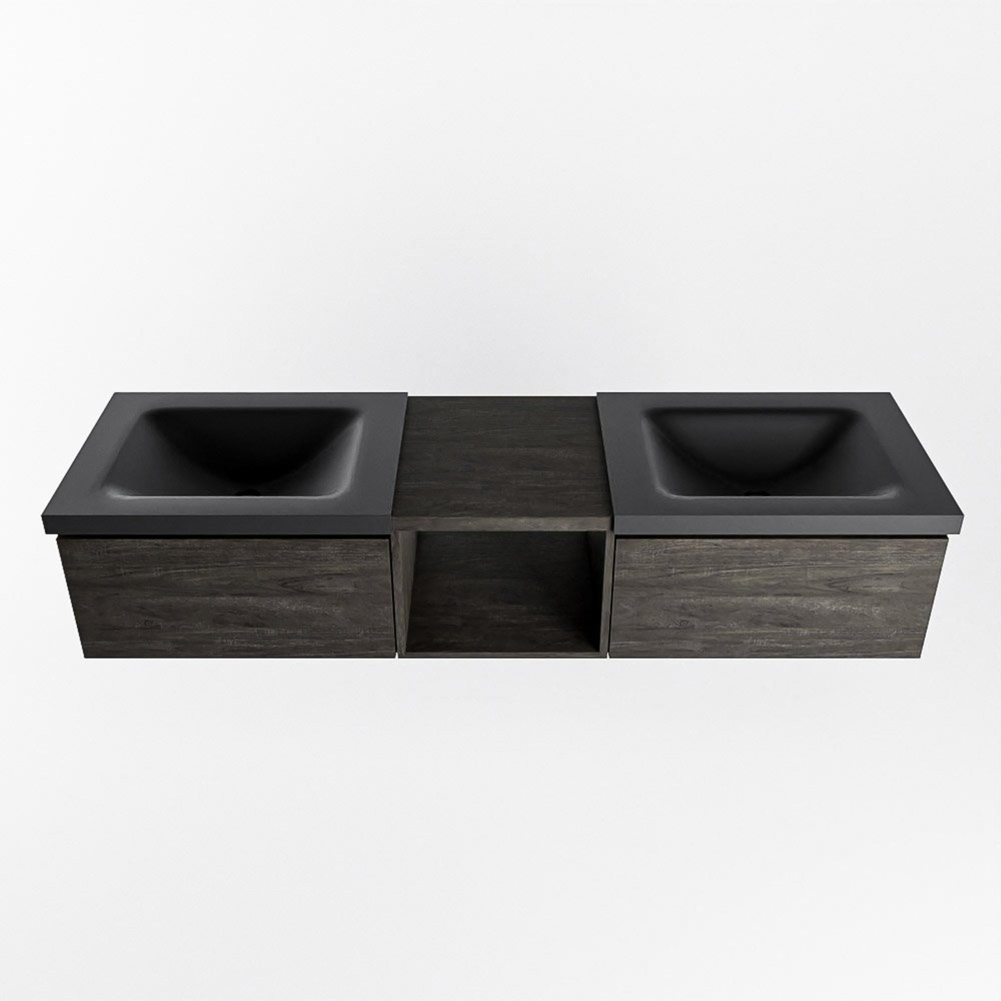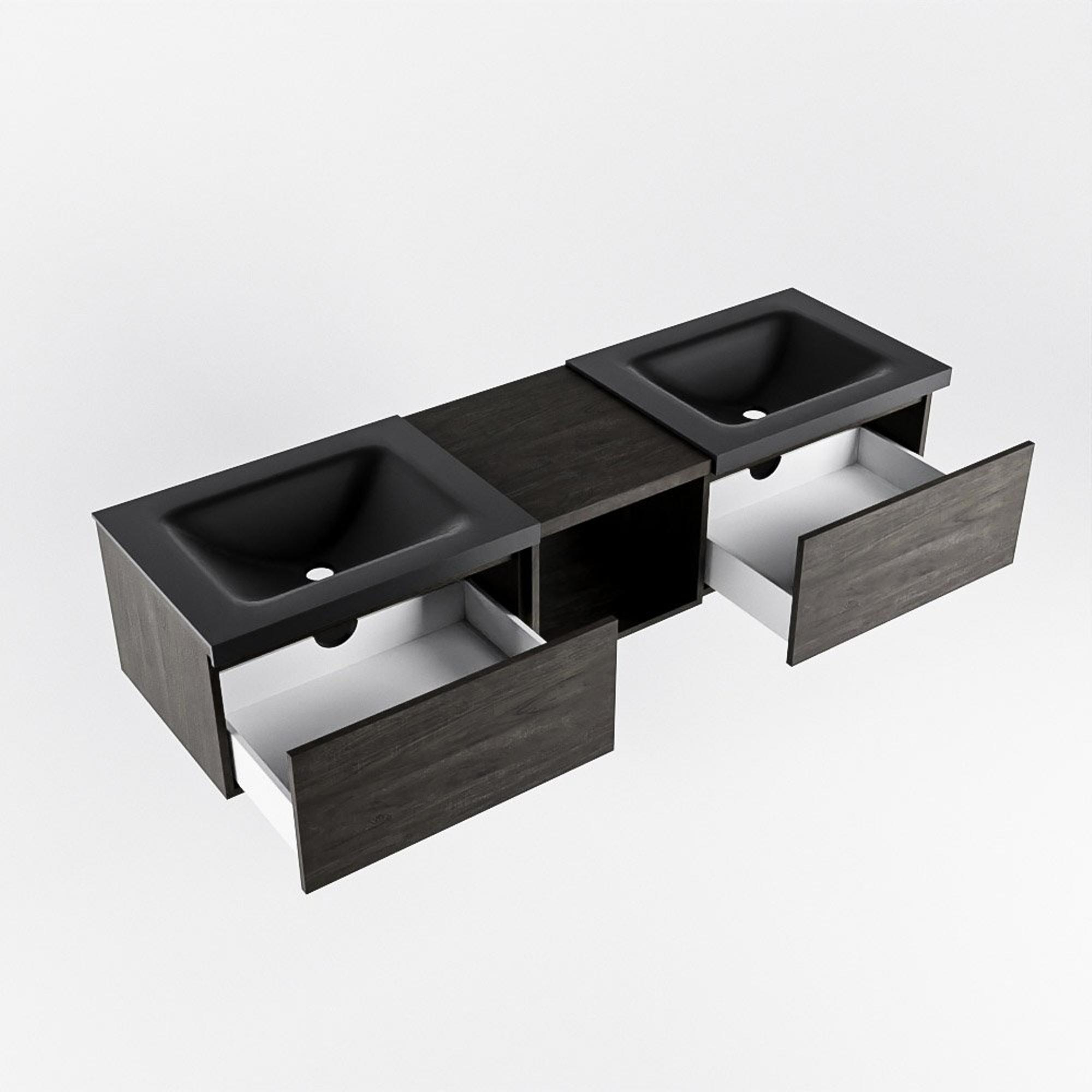 MONDIAZ BUKLA 160cm meuble de salle de bain avec module ouvert 40 couleur Marron foncé avec 2 tiroirs. Lavabo CLOUD double 2 trous de robinet couleur Urban.