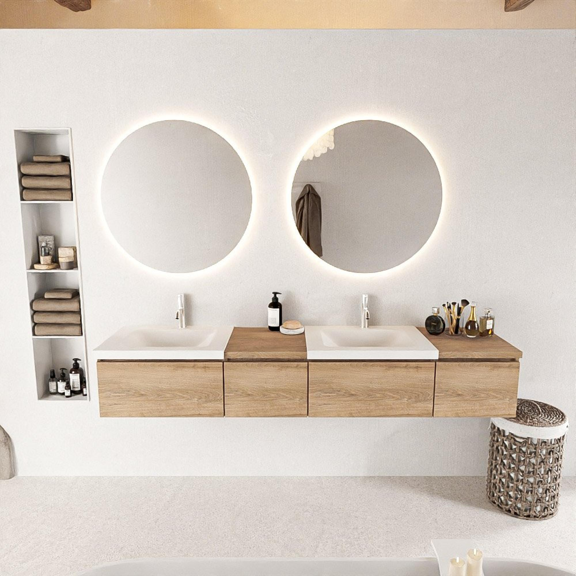 Découvrez le luxe ultime avec ce meuble de salle de bain. La combinaison de la couleur Chêne Lavé et du double lavabo en Talc crée une apparence raffinée dans votre salle de bain. Les 4 tiroirs offrent suffisamment d'espace de rangement pour tous vos accessoires de salle de bain, gardant tout bien organisé.
