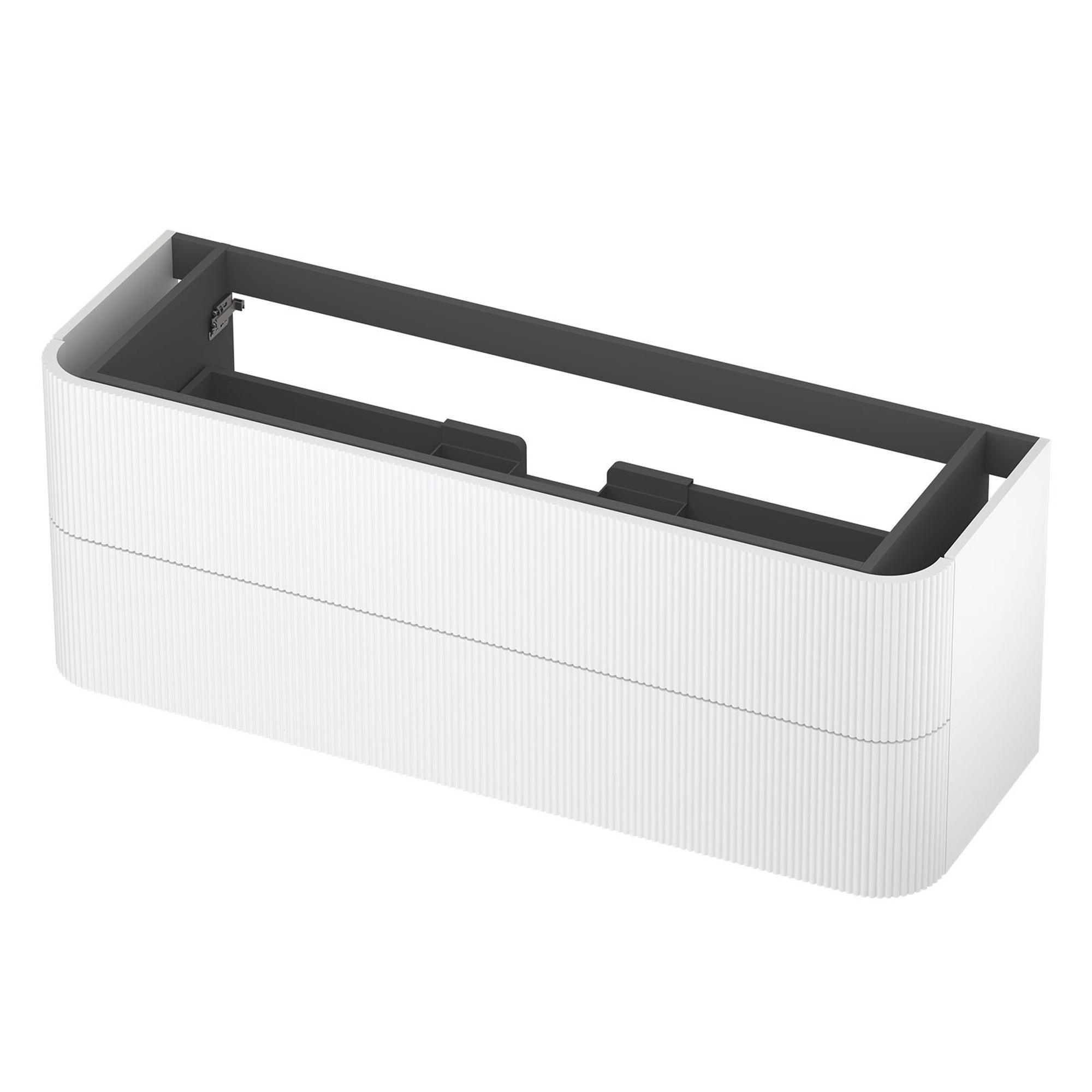 Ce meuble sous-lavabo généreux est idéal si vous souhaitez combiner une salle de bains épurée et moderne avec beaucoup d’espace de rangement et une apparence calme. Grâce à sa grande largeur, ce meuble convient parfaitement aux salles de bains familiales, aux salles de bains à l’ambiance d’hôtel de luxe ou à une spacieuse suite parentale. Les angles arrondis et la finition blanc mat créent un jeu de lignes doux et chaleureux, tandis que la structure à rainures verticales sur la façade ajoute justement un accent de design raffiné. Avec deux tiroirs pratiques, vous gardez vos accessoires de salle de bains du quotidien soigneusement hors de vue et l’ensemble paraît toujours ordonné. Comme le meuble est suspendu au mur, le sol reste dégagé et votre salle de bains semble plus grande et plus aérée. Que vous optiez pour un style minimaliste, scandinave ou moderne, ce meuble bas s’y adapte sans effort, surtout en combinaison avec un beau plan vasque et un miroir assorti.