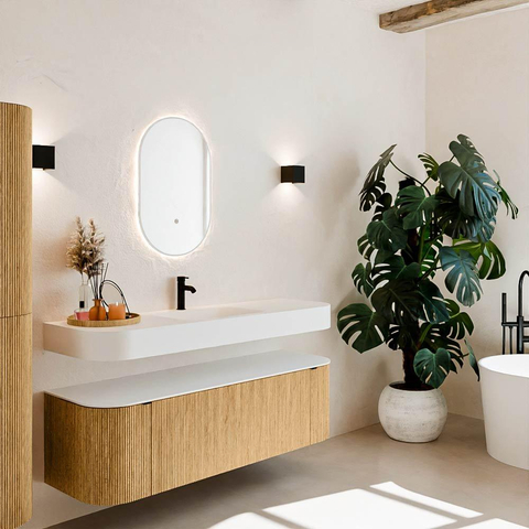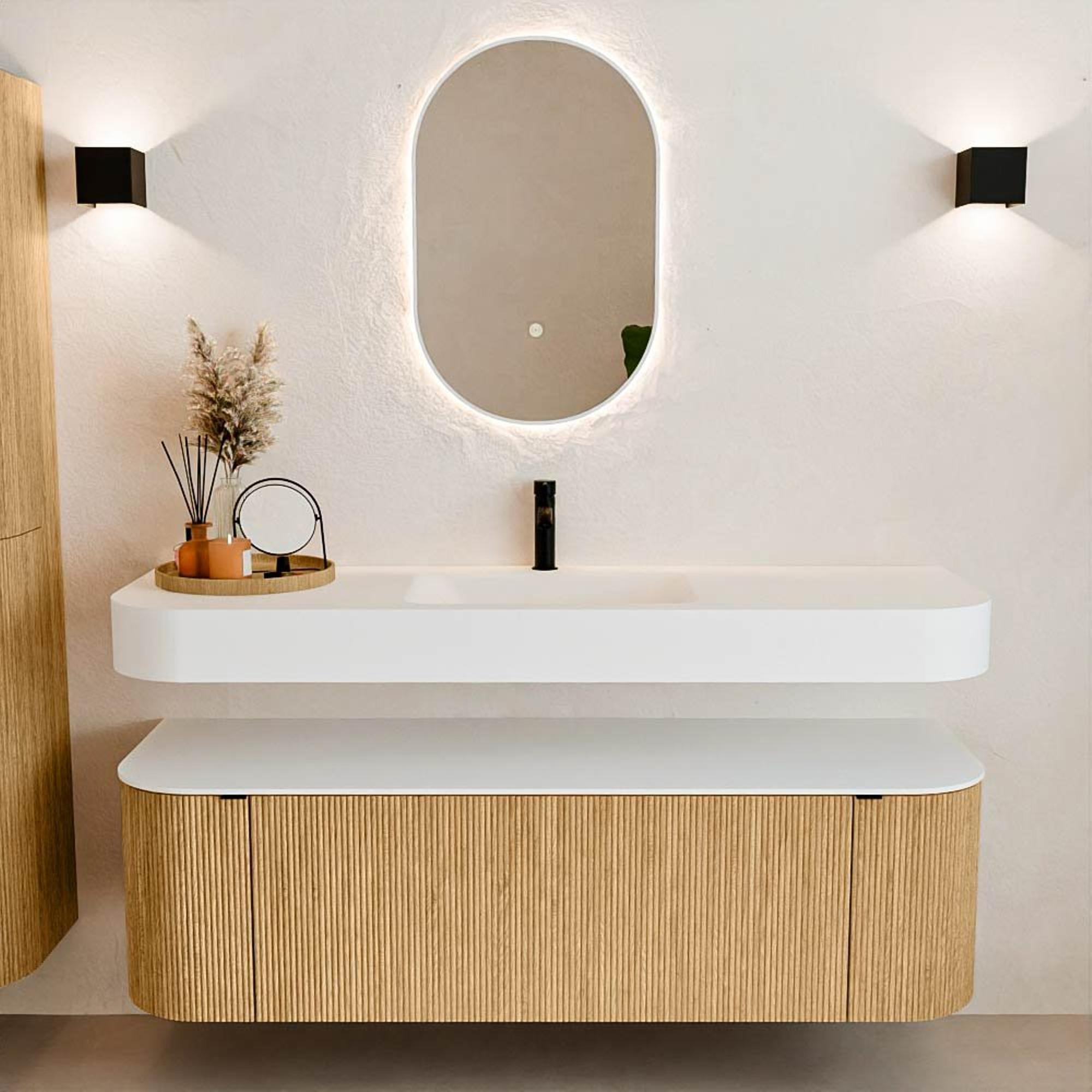 Au-dessus du meuble flotte une vasque suspendue assortie aux angles arrondis – parfaitement adaptée à la forme du meuble. La vasque est en Solid Surface et suit subtilement les lignes du meuble inférieur, créant un ensemble harmonieux. Le plan de travail en Solid Surface constitue une base solide et facile d'entretien, complétant la combinaison.