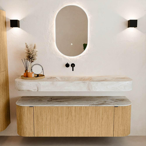 MONDIAZ THOR-DLUX 150cm meuble de salle de bains arrondi gauche + droite couleur Oak avec 1 tiroir et 2 portes. Vasque suspendue CLOUD Milieu sans trou de robinet couleur Frappe.
