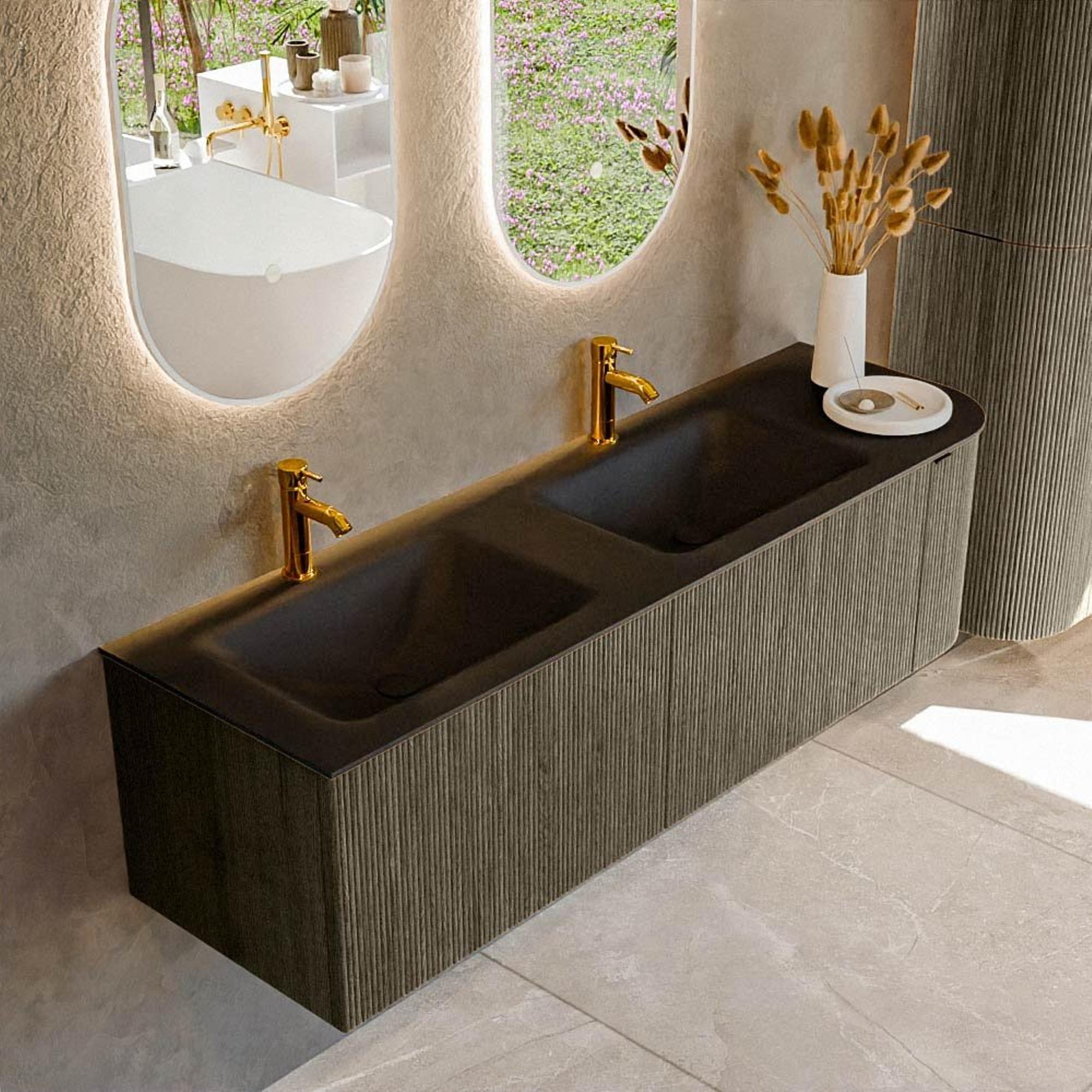 Mondiaz KURVE Ensemble de meuble salle de bain - 155x46x40cm - 2 tiroirs - 1 porte - lavabo en solid surface - double / gauche - 2 trous de robinet - Shadow