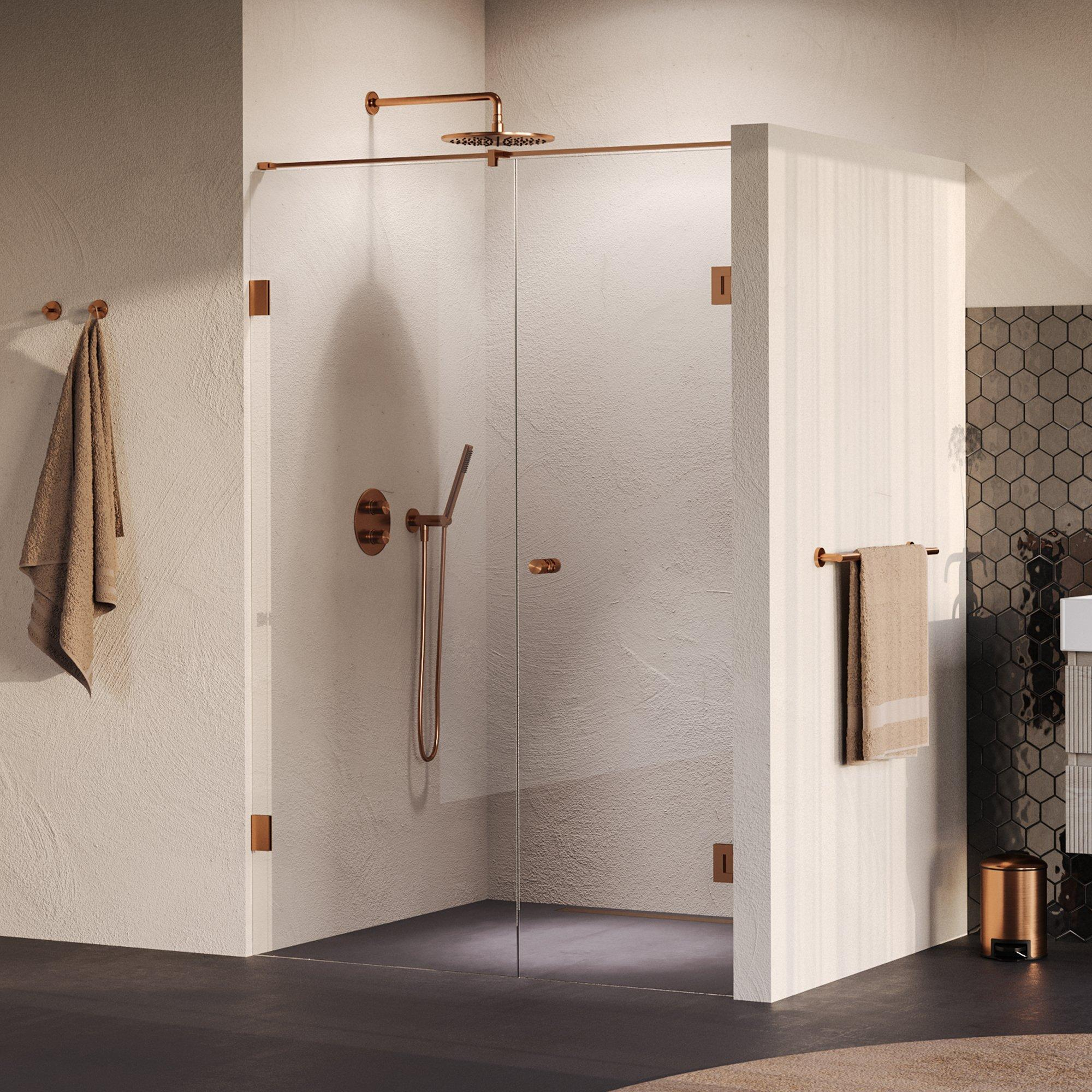 La porte de niche est un exemple d’élégance grâce au verre clair et à la subtile finition cuivre brossé PVD. Cette combinaison crée une atmosphère chaleureuse et accueillante dans votre salle de bains. Le design est intemporel et s’adapte parfaitement à différents styles d’intérieur, du minimalisme moderne au classique. Grâce au verre clair, l’espace reste ouvert et lumineux, ce qui contribue à une sensation d’ampleur. Ainsi, vous profitez non seulement d’une porte de douche fonctionnelle, mais aussi d’un élément stylé qui élève votre salle de bains à un niveau supérieur.