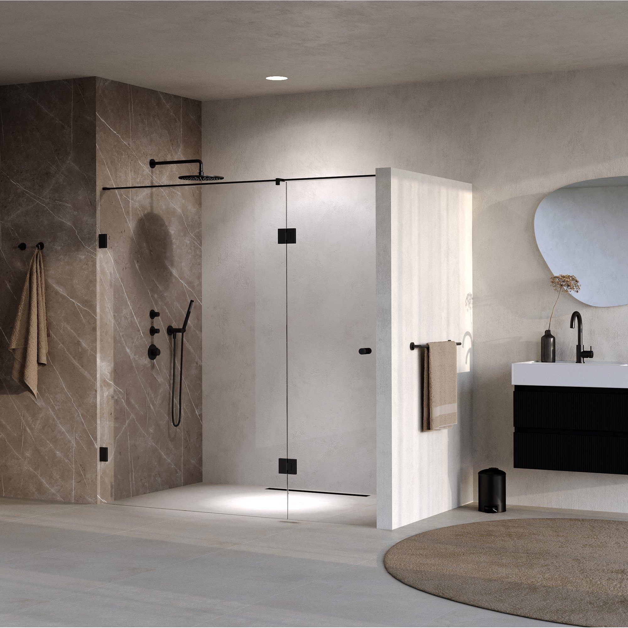 La combinaison de verre clair avec une finition noir mat confère à cette porte de niche une apparence intemporelle et élégante. Le design minimaliste s'intègre parfaitement dans les salles de bains modernes comme classiques. Grâce au caractère ouvert du verre, l'espace paraît plus grand et plus lumineux, contribuant à une ambiance agréable et apaisante. Les détails noir mat créent un contraste subtil et rendent l'ensemble particulièrement remarquable sans dominer. Ainsi, vous ajoutez un élément élégant qui améliore immédiatement votre salle de bains.