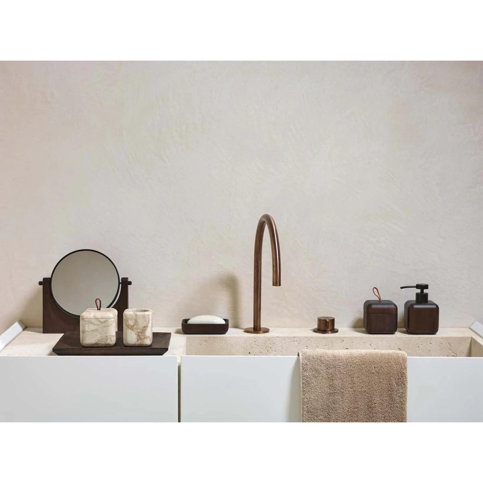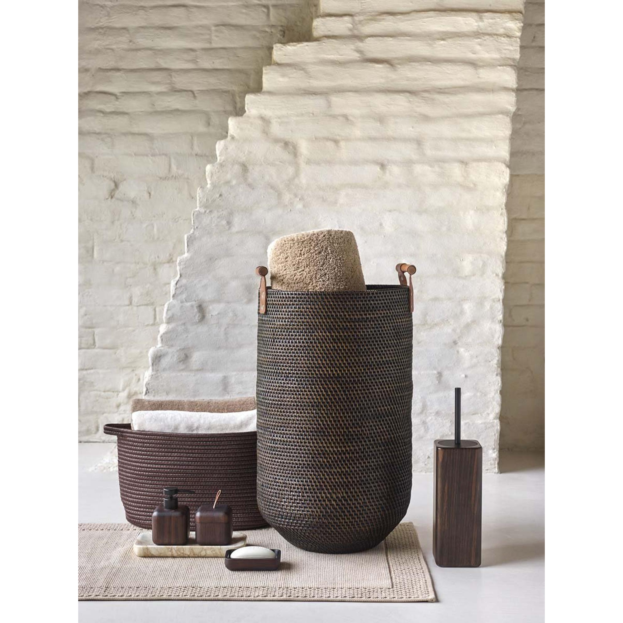 Le distributeur de savon Aquanova Ebony en couleur Pecan-538 est un ajout élégant et fonctionnel à votre salle de bains ou cuisine. Ce distributeur artisanal de la série Ebony a la forme caractéristique de cube arrondi avec des dimensions de 8 x 8 cm et une hauteur de 13 cm. L'utilisation de bois d'ébène foncé donne au distributeur un aspect robuste, chic et naturel, où la fine structure du bois reste magnifiquement visible.Le distributeur a une capacité de 150 ml et est équipé d'une pompe noire en acier inoxydable, ce qui assure une finition moderne et luxueuse. La couleur brun foncé neutre Pecan s'intègre facilement dans différents styles d'intérieur et se combine parfaitement avec d'autres accessoires de la série Ebony. Idéal pour le savon liquide pour les mains ou la lotion.