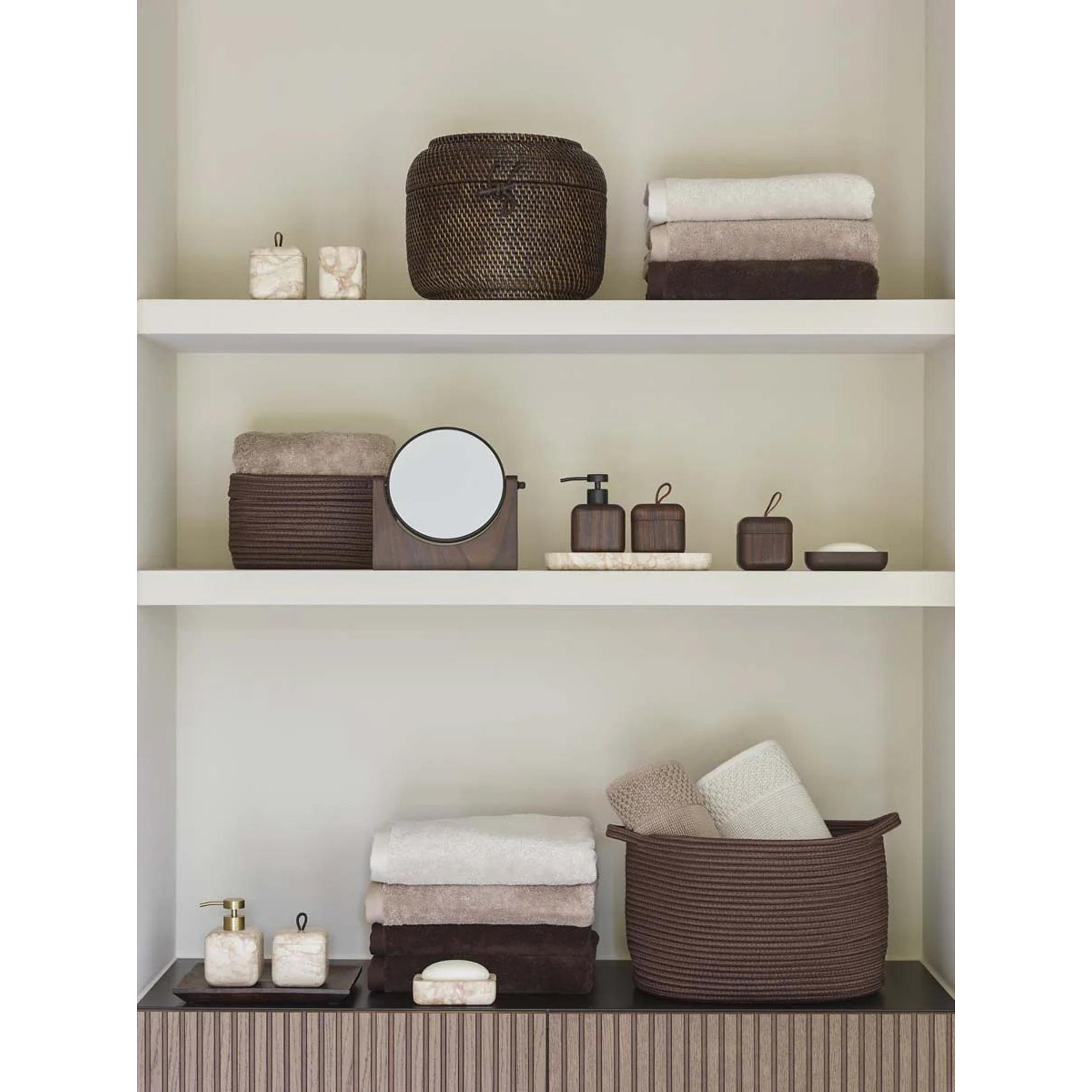 La boîte beauté Aquanova Blake en couleur Desert-118 est un ajout élégant et pratique à votre salle de bains ou chambre. Cette boîte beauté faite main de la série Blake présente la forme caractéristique de cube arrondi avec des dimensions de 8 x 8 x 8 cm. La pierre naturelle beige avec un marbrage doux brun clair confère au récipient une apparence raffinée, digne d'un spa, qui dégage calme et luxe.La boîte beauté est équipée d'un couvercle assorti avec une boucle marron, ce qui permet de l'ouvrir facilement. Parfaite pour ranger de petits objets tels que bijoux, disques démaquillants ou autres produits de soin. La couleur neutre Desert se combine parfaitement avec des teintes chaudes ou froides et s'intègre sans effort dans divers styles d'intérieur.