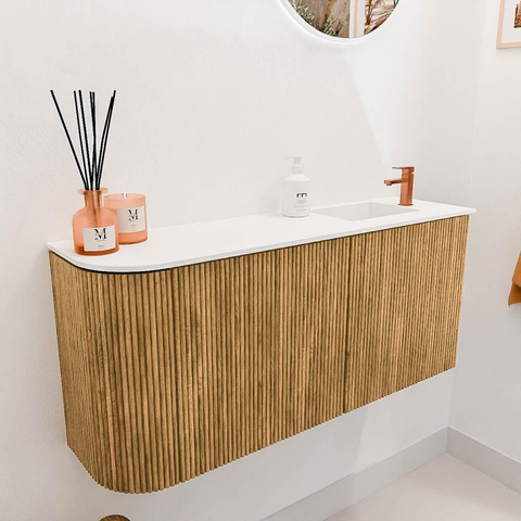 La combinaison de chêne massif et de placage chêne donne au meuble une apparence naturelle et luxueuse qui s'intègre facilement dans différents styles d'intérieur. Les rainures verticales sur la façade apportent une touche contemporaine, rendant le meuble à la fois classique et moderne. L'arrondi subtil sur le côté gauche adoucit et rend le design plus ludique, créant une atmosphère accueillante. Ainsi, avec ce meuble, vous ajoutez un élément stylé qui attire immédiatement l'attention et donne une touche personnelle à votre salle de bains.