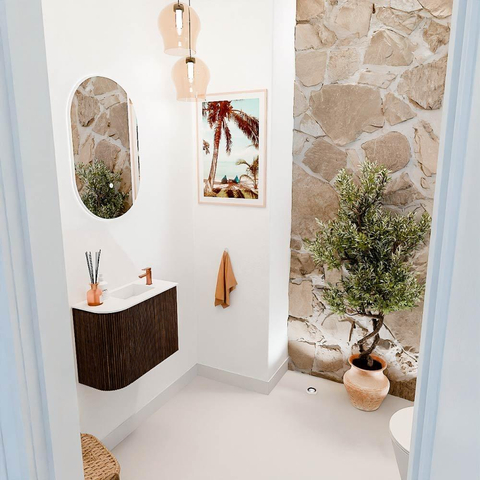 La couleur chaude noyer et la structure naturelle du bois donnent au meuble une apparence luxueuse qui attire immédiatement l'attention. Les rainures verticales sur les façades apportent un détail moderne et raffiné, faisant de ce meuble un véritable point fort dans votre salle de bains. L'arrondi subtil sur le côté gauche confère un caractère ludique et unique, ce qui rend le design distinctif. Ce meuble stylé ajoute non seulement de l'ambiance, mais augmente aussi la valeur de votre salle de bains grâce à son aspect haut de gamme.