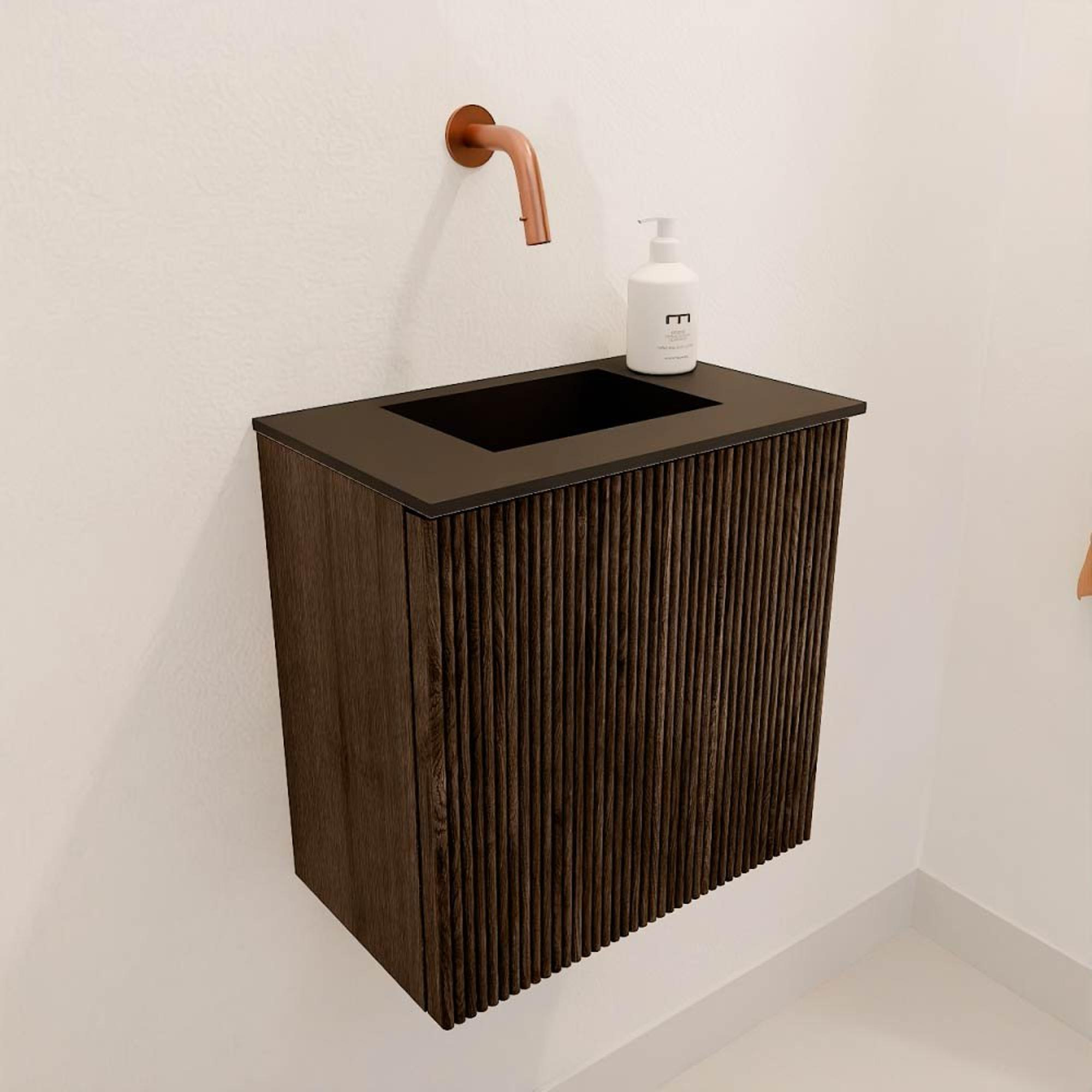 Avec ce meuble compact, vous donnez immédiatement à votre salle de bains ou toilettes d'invités une mise à niveau élégante. Il combine une apparence chaleureuse et naturelle avec une fonctionnalité intelligente, ce qui le rend parfait pour les petits espaces où vous ne voulez pas compromettre le design et la qualité. La structure subtile en rainures sur les façades apporte une touche contemporaine qui s'harmonise facilement avec différents styles d'intérieur. Grâce aux matériaux et à la finition soigneusement choisis, le meuble ne donne pas seulement une sensation de luxe, mais conserve également son charme à long terme. La vasque est placée au centre et sans trou de robinet, vous permettant de choisir vous-même le robinet qui correspond le mieux à vos souhaits. Ainsi, vous créez une installation de salle de bains personnelle et réfléchie, à la fois pratique et accueillante.