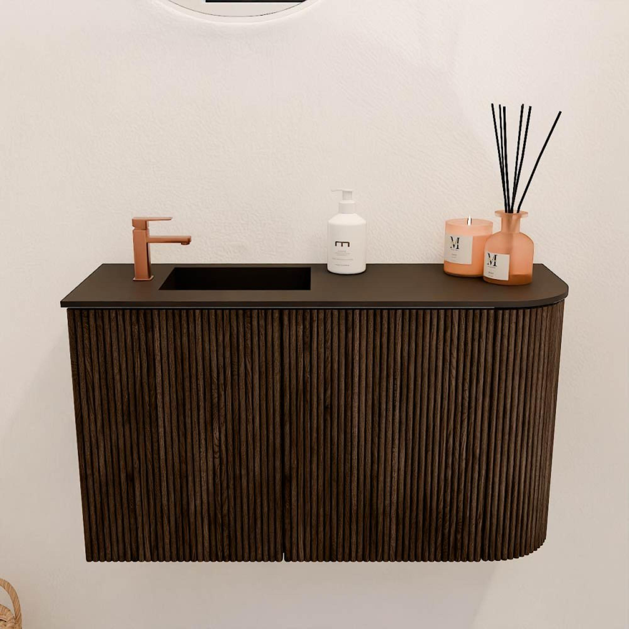 La chaude couleur noyer et le motif côtelé élégant donnent à ce meuble une apparence unique qui attire immédiatement l'attention. Le design avec l'arrondi droit crée un effet ludique et pourtant épuré, faisant de ce meuble un véritable point focal dans votre salle de bains. En combinant des tons bois naturels et des formes modernes, vous créez une atmosphère à la fois apaisante et raffinée. Cela rend le meuble parfait pour ceux qui aiment une salle de bains élégante avec du caractère.