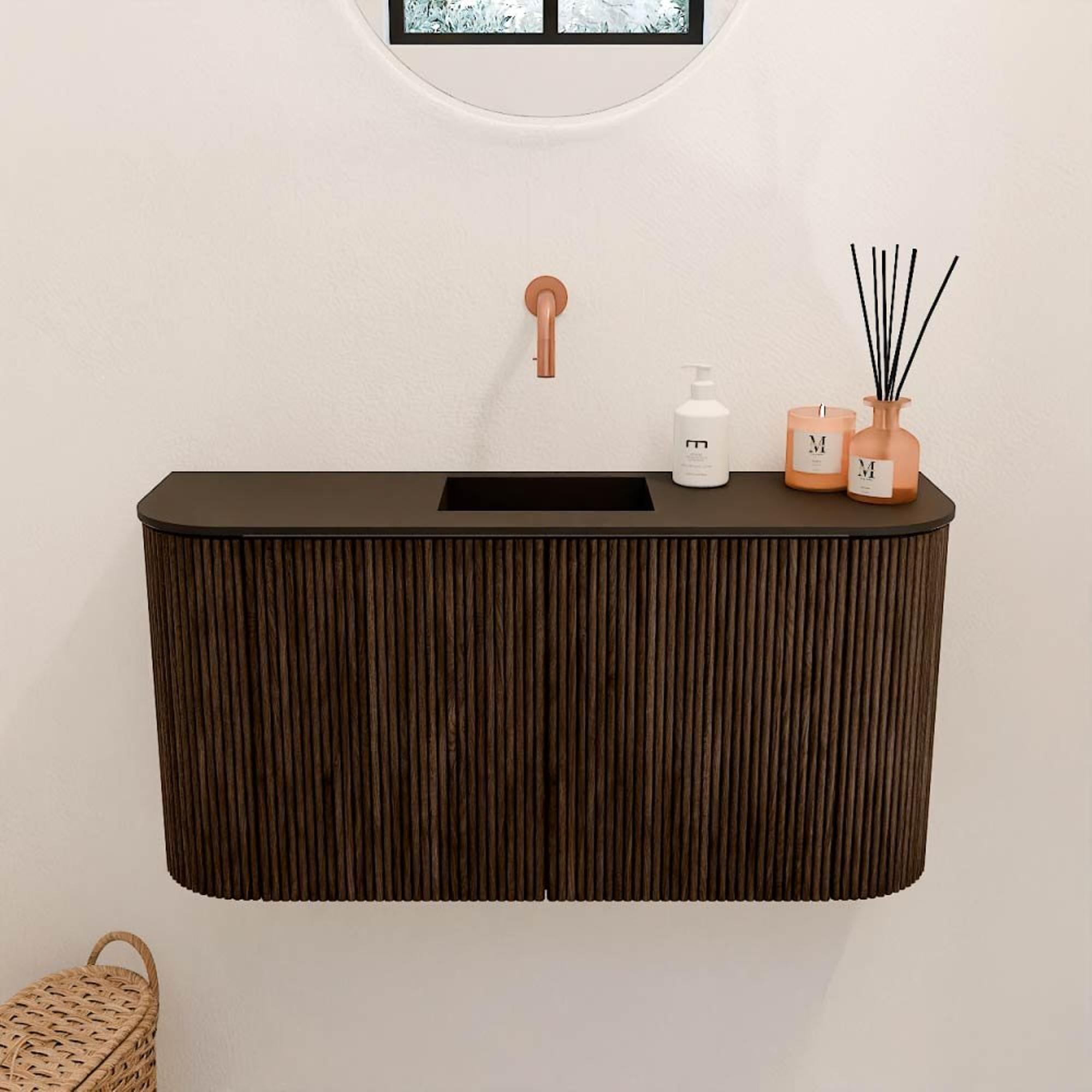Le meuble se distingue immédiatement par son apparence élégante. La combinaison de chêne massif et de placage de chêne en noyer crée une atmosphère naturelle et chaleureuse. Les rainures verticales à l’avant donnent un caractère unique à l’ensemble, tandis que les formes arrondies apportent un aspect doux et invitant. Ce meuble est un véritable point focal qui donne à votre salle de bains un aspect luxueux et moderne sans dominer l’espace.
