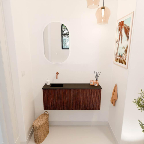 Le meuble se distingue immédiatement par son panneau à nervures et la riche couleur Ruby qui ajoute chaleur et caractère à votre salle de bains. L'association avec la vasque Urban crée un contraste moderne qui reste naturel. Cela rend le meuble parfait pour ceux qui aiment un style contemporain mais intemporel. L'utilisation de chêne massif et de placage dégage qualité et savoir-faire. Ainsi, vous offrez à votre salle de bains non seulement une mise à niveau élégante, mais aussi un investissement durable dans le design.