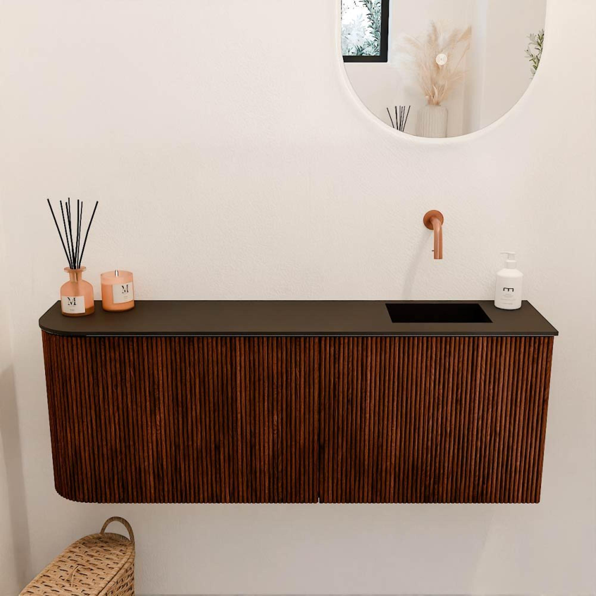 Le meuble se distingue immédiatement par son design unique avec des rainures verticales et la finition arrondie à gauche. La combinaison de la couleur chaude Ruby et de la vasque Urban calme offre un aspect exclusif qui donne à votre salle de bains une atmosphère luxueuse. Ce meuble n'est pas seulement un élément fonctionnel, mais aussi un véritable point focal qui complète votre intérieur. Grâce aux détails subtils et à l'artisanat de haute qualité, le meuble dégage classe et élégance, donnant à votre salle de bains une touche personnelle et raffinée.