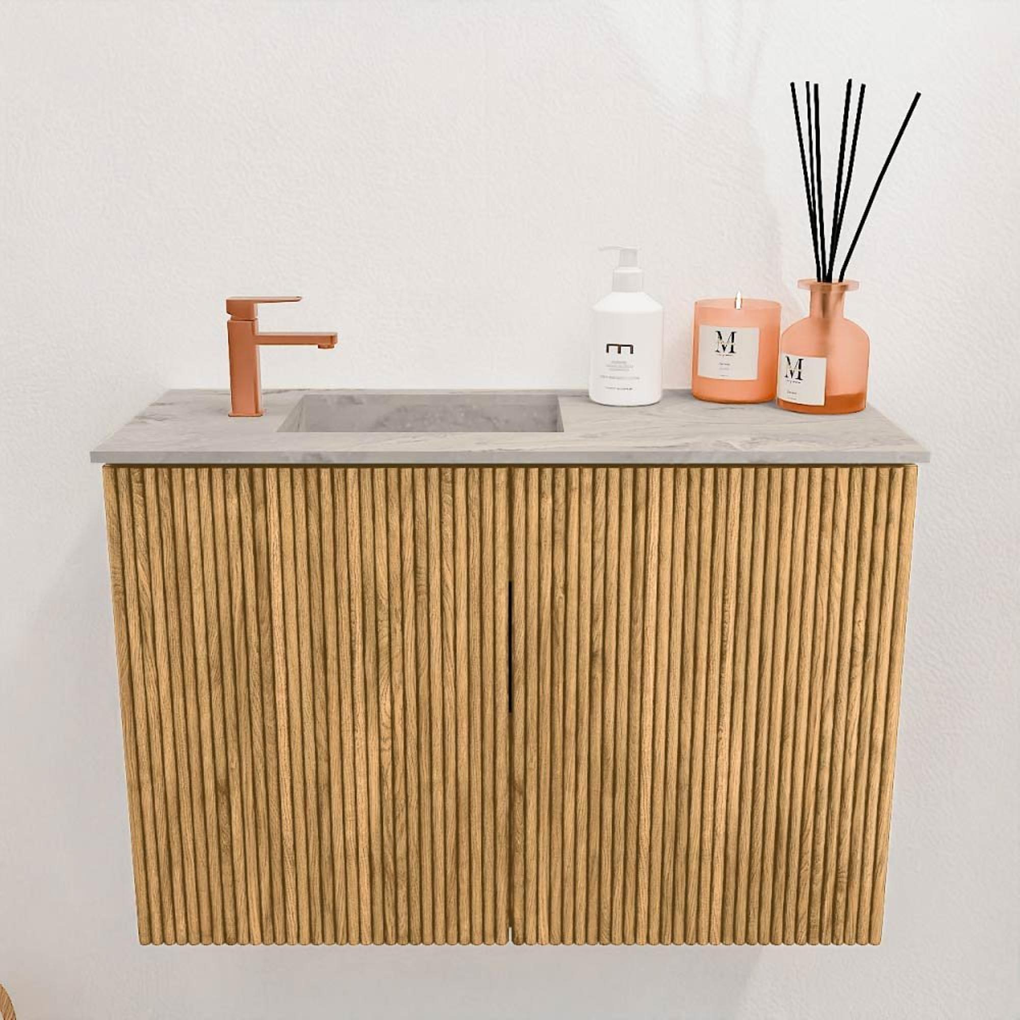 La finition Oak chaleureuse donne au meuble une apparence naturelle et intemporelle qui s'harmonise sans effort avec divers styles d'intérieur. Que vous choisissiez un design moderne, campagnard ou industriel, ce meuble s'y adapte parfaitement. La vasque glace ajoute un contraste subtil, rendant l'ensemble frais et lumineux. Grâce aux lignes épurées et au design minimaliste, vous créez une atmosphère calme et élégante dans votre salle de bains. Ainsi, vous profitez non seulement de la fonctionnalité, mais aussi d'une pièce maîtresse élégante qui complète votre espace.