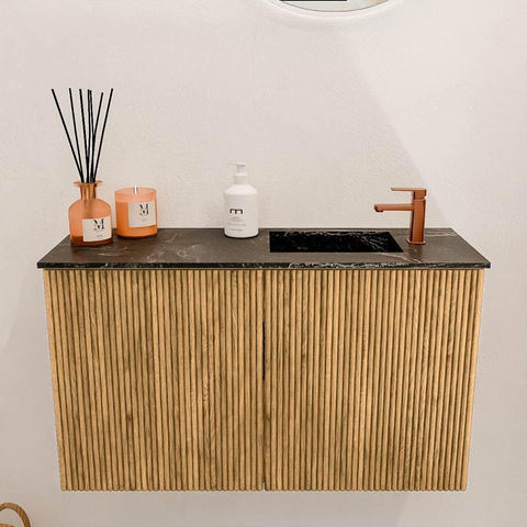 Avec ce magnifique meuble, vous donnez immédiatement à votre salle de bains une ambiance chaleureuse et naturelle. Il combine le charme intemporel du chêne massif avec un design moderne qui s'adapte parfaitement à différents styles d'intérieur. Grâce aux subtiles rainures verticales sur les façades, le meuble acquiert un caractère ludique et contemporain, tandis que les côtés en placage chêne assurent une finition raffinée. La vasque de couleur Lava ajoute un contraste robuste et élégant, avec un trou de robinet pratique sur le côté droit pour un robinet de votre choix. Ce meuble est non seulement un plaisir pour les yeux, mais aussi particulièrement fonctionnel. Avec deux portes spacieuses, vous rangez tous vos accessoires de salle de bains de manière ordonnée, pour un espace toujours rangé et apaisant. Que vous planifiez une rénovation complète ou une mise à jour subtile, ce meuble transforme votre salle de bains en un lieu où vous commencez et terminez chaque jour avec plaisir.