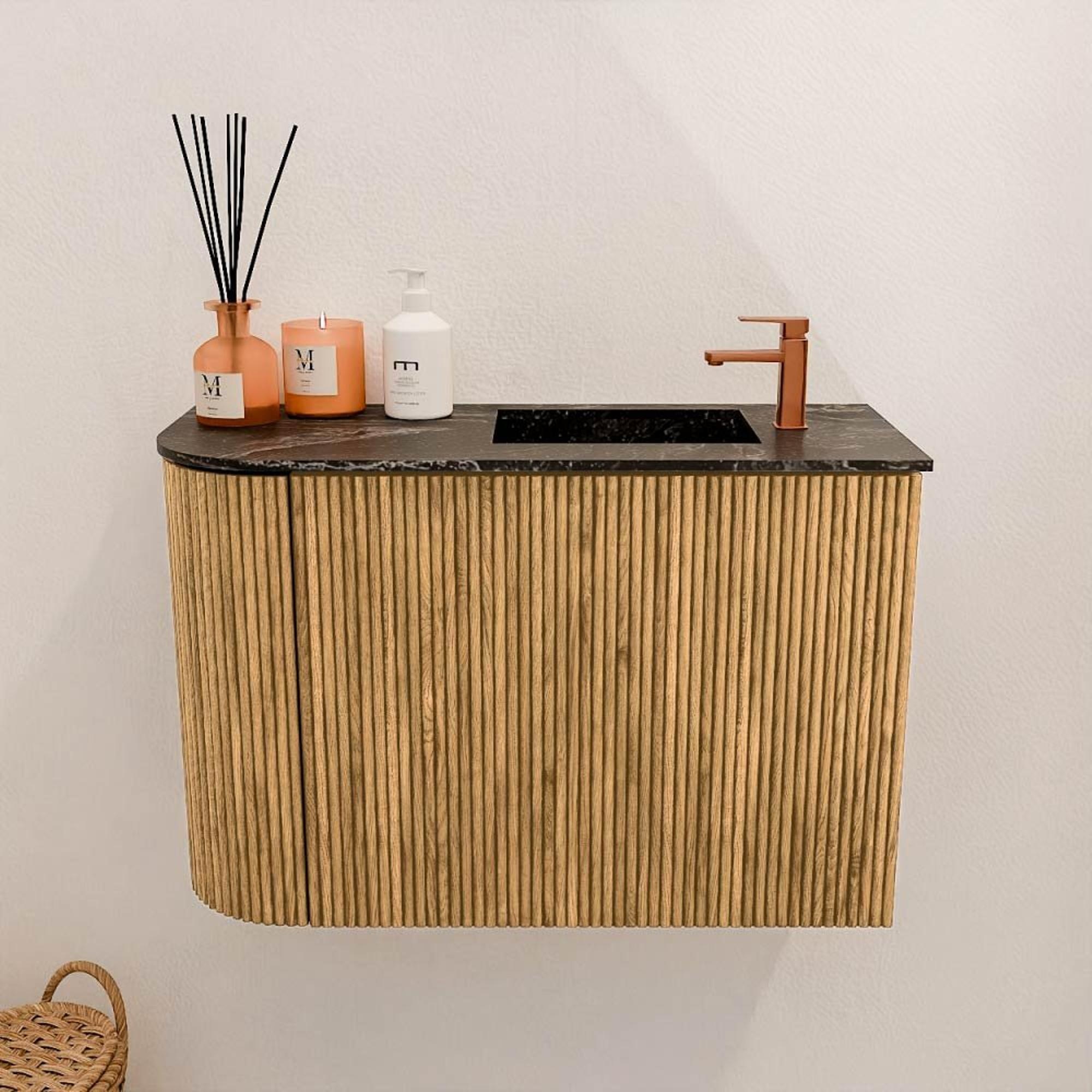 La combinaison de chêne massif avec des rainures verticales donne au meuble une apparence intemporelle et naturelle. Cela crée non seulement une atmosphère chaleureuse, mais aussi une sensation de luxe dans votre salle de bains. L'arrondi subtil sur le côté gauche rend le design unique et crée une forme douce et accueillante qui s'adapte parfaitement aux intérieurs modernes. La vasque de couleur lava ajoute un contraste audacieux, donnant à l'ensemble un aspect contemporain qui semble à la fois classique et moderne. Ainsi, vous obtenez un meuble qui s'intègre facilement à différents styles et tendances.