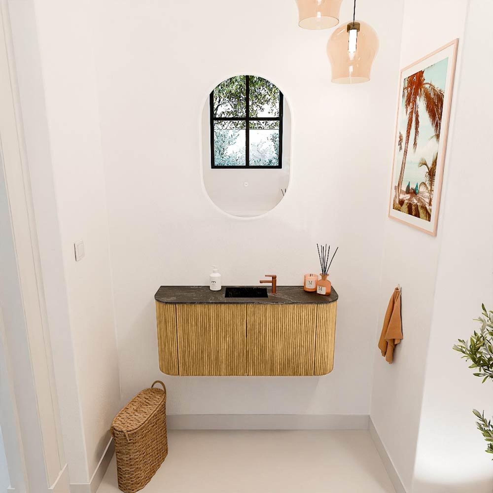 La combinaison de la chaude couleur chêne avec la vasque lava épurée donne à ce meuble un aspect unique et moderne tout en restant intemporel. Les arrondis subtils sur les côtés gauche et droit offrent un look doux et accueillant qui s'adapte à tous les intérieurs. Ce meuble n'est pas seulement un élément fonctionnel, mais aussi un véritable point focal qui améliore immédiatement l'ambiance de votre salle de bains. Grâce à son design réfléchi, vous ajoutez une touche de luxe sans excès, ce qui permet au meuble de s'intégrer facilement dans divers styles, du rustique à l'industriel.