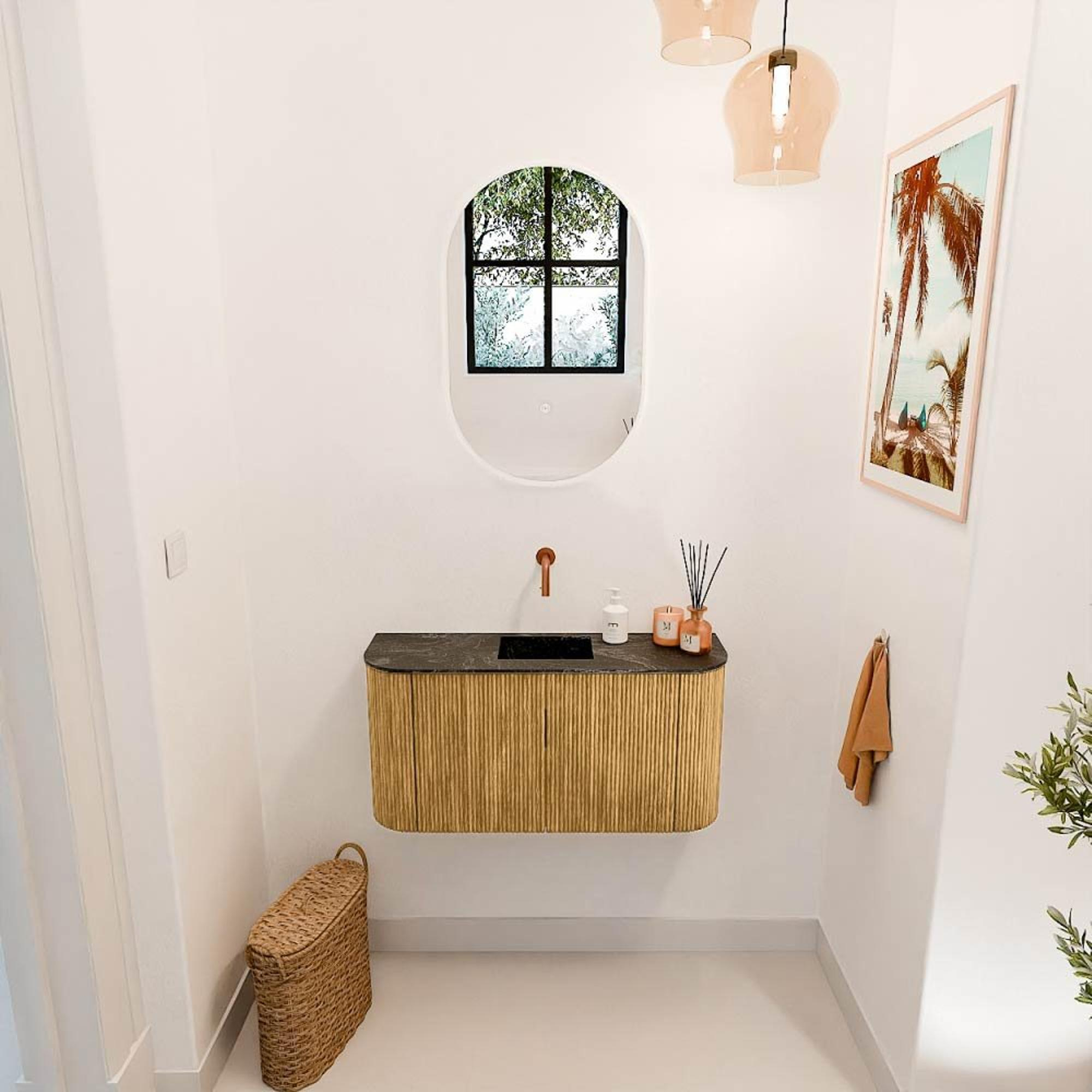 Mondiaz JOYA-DLUX 83.2cm meuble de salle de bains WC - arrondi gauche et droite couleur Chêne - Vasque FAYE position Milieu Sans trou de robinet couleur Lava.