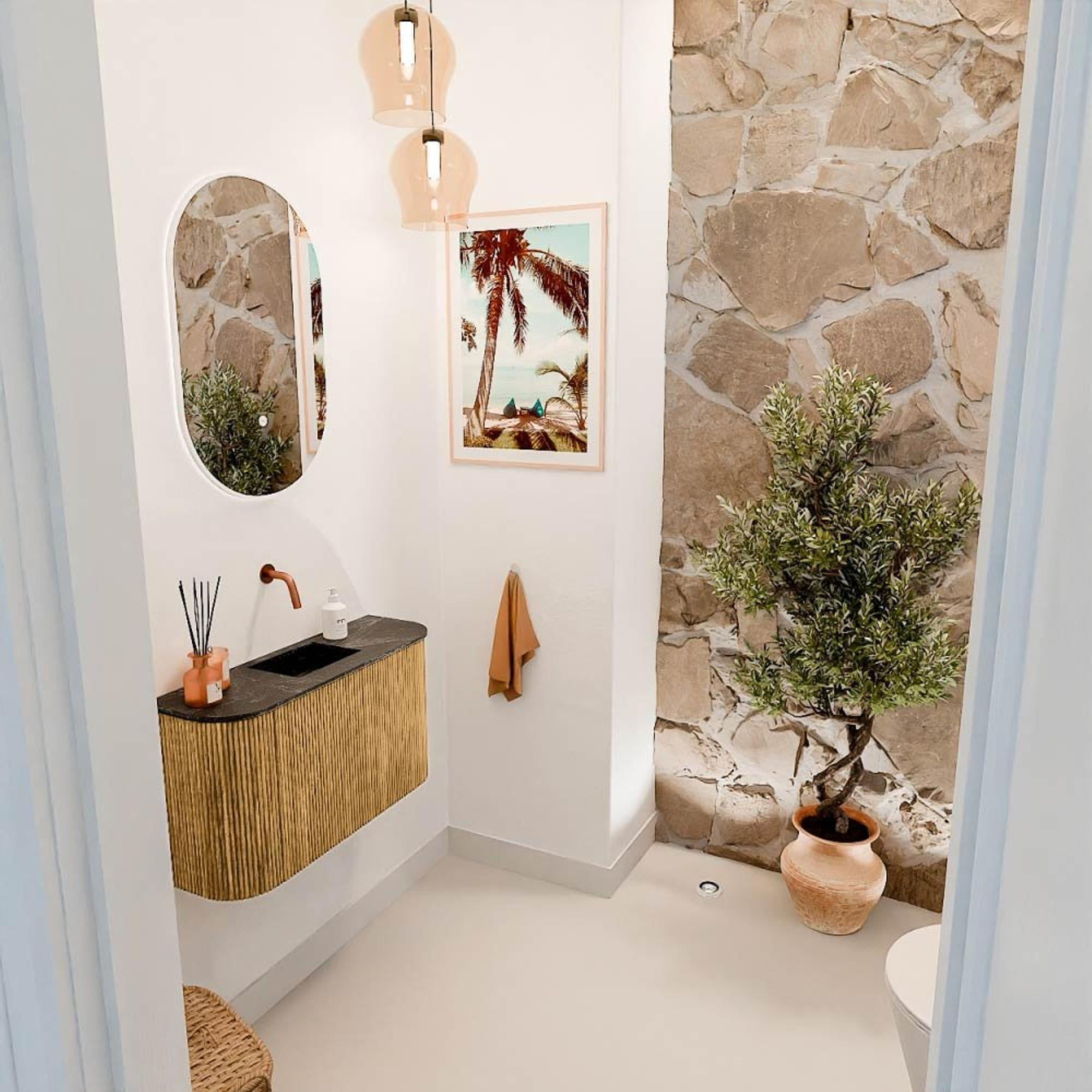 Le meuble se distingue immédiatement par sa façade élégante en chêne massif et les arrondis subtils des deux côtés. Cette couleur bois naturelle apporte chaleur et caractère à votre salle de bains, en faisant un lieu accueillant. La vasque couleur lava crée un beau contraste et ajoute une touche moderne. Grâce au design épuré et aux matériaux de haute qualité, ce meuble s’intègre parfaitement dans des salles de bains classiques comme contemporaines. Vous créez ainsi une atmosphère harmonieuse qui vous inspire chaque jour.