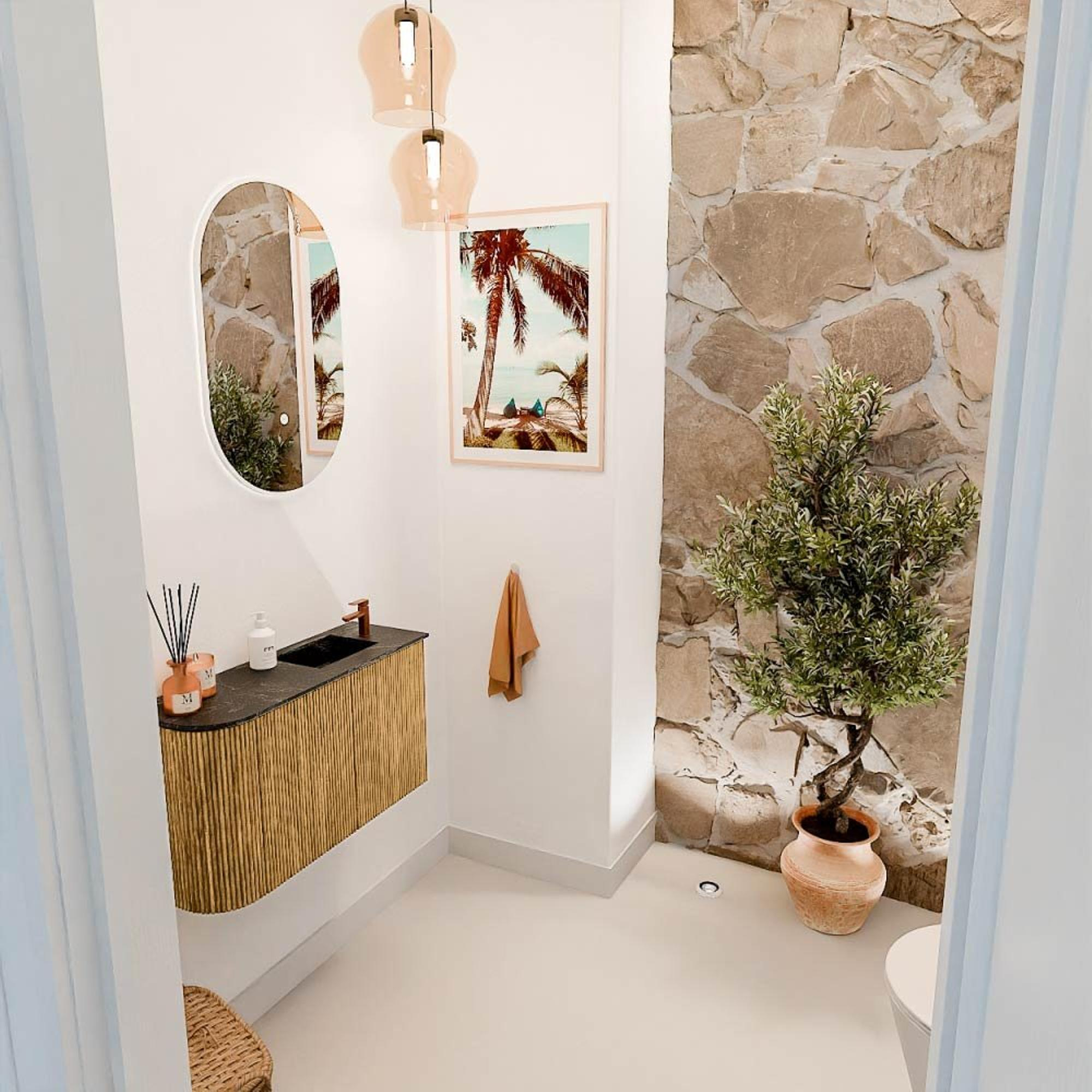 Transformez vos toilettes d'invités avec ce magnifique meuble qui combine style et fonctionnalité sans effort. Grâce à son format compact de 71,6 cm de large et à l'arrondi astucieux sur le côté gauche, ce meuble s'adapte parfaitement aux petits espaces sans sacrifier le confort. L'aspect chaleureux et naturel du bois de chêne apporte immédiatement une ambiance luxueuse et accueillante à votre salle de bains. La vasque avec un trou de robinet à droite dans une couleur lave profonde ajoute une touche contemporaine qui contraste magnifiquement avec le bois. Ce meuble n'est pas seulement un plaisir pour les yeux, mais aussi extrêmement pratique grâce à la fixation murale qui crée une sensation d'espace et facilite le nettoyage. Ainsi, vous profitez chaque jour d'un environnement de salle de bains élégant et ordonné qui impressionnera certainement vos invités.