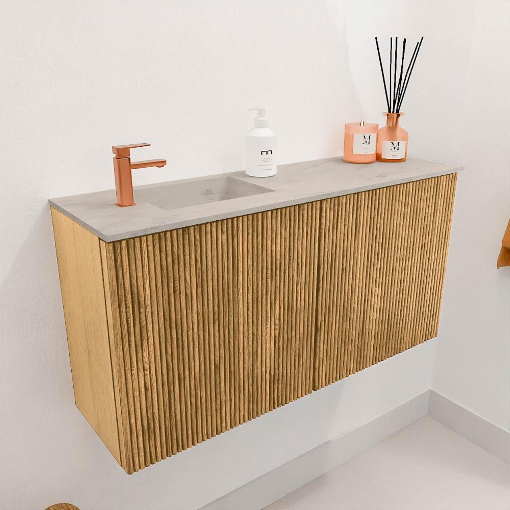 Les rainures verticales dans le chêne donnent au meuble un aspect moderne et élégant qui est intemporel. Cela permet au meuble de s’intégrer facilement aussi bien dans des salles de bains classiques que contemporaines. La couleur chaude Oak apporte une atmosphère naturelle à votre espace, rendant votre salle de bains immédiatement accueillante. Grâce au design subtil, le meuble reste un point focal sans dominer, contribuant à un environnement de salle de bains harmonieux et calme.