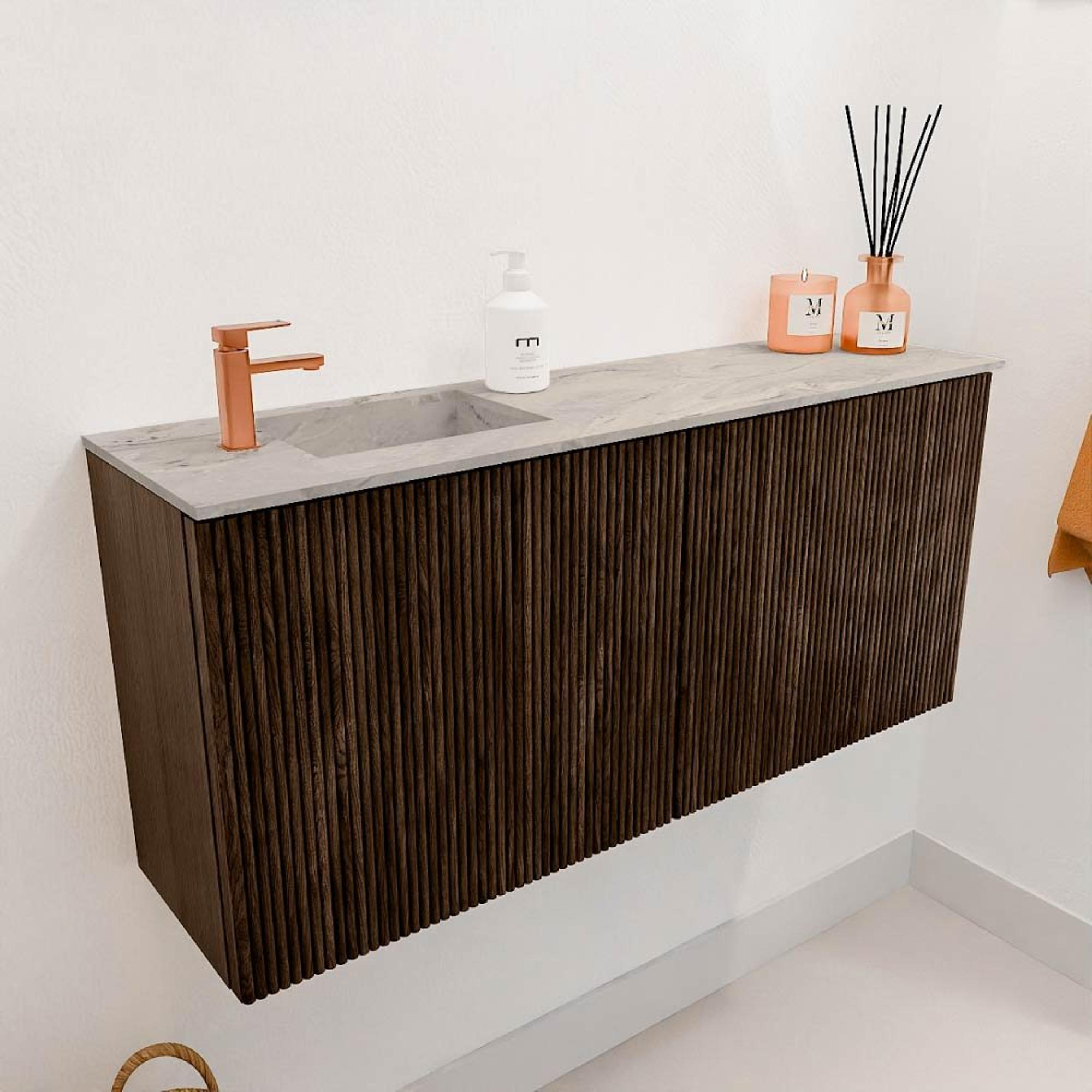 Avec ce magnifique meuble, vous donnez immédiatement à votre salle de bains une ambiance chaleureuse et naturelle. La combinaison d'un panneau avant en chêne massif couleur Walnut et d'accents subtils et brillants crée un ensemble intemporel et élégant. Grâce à la conception intelligente avec une vasque à gauche et un trou de robinet, vous profitez d'une facilité d'utilisation optimale sans sacrifier l'élégance. Ce meuble n'est pas seulement un plaisir pour les yeux, mais aussi particulièrement pratique : il offre suffisamment d'espace de rangement pour garder votre salle de bains propre et ordonnée. Grâce aux matériaux de haute qualité et à la finition soignée, vous ressentez une sensation de luxe et de durabilité, faisant de votre salle de bains un endroit où vous commencez et terminez chaque jour avec plaisir.