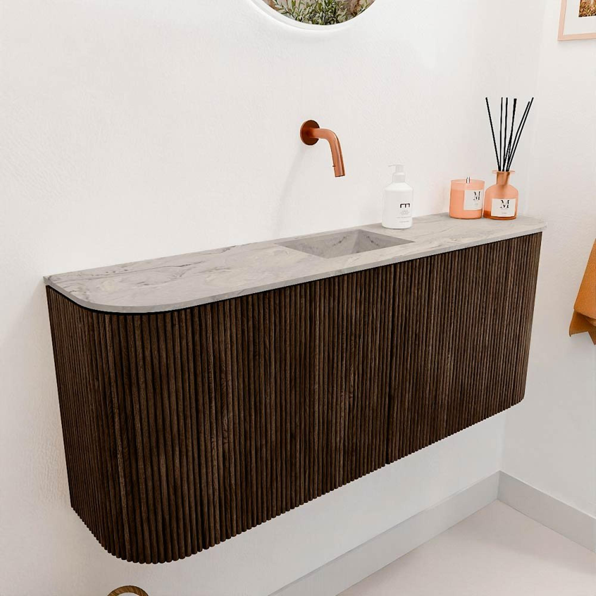 La finition raffinée avec des rainures verticales et la chaude couleur noyer confèrent au meuble une élégance intemporelle qui s'harmonise facilement avec différents styles d'intérieur. Que vous choisissiez un intérieur moderne, campagnard ou classique, ce meuble ajoute toujours une touche de luxe. Les courbes subtiles sur les côtés gauche et droit créent un effet doux et accueillant, faisant du meuble un véritable point focal. Ainsi, vous profitez non seulement d'un meuble fonctionnel, mais aussi d'une pièce maîtresse élégante dans votre salle de bains.