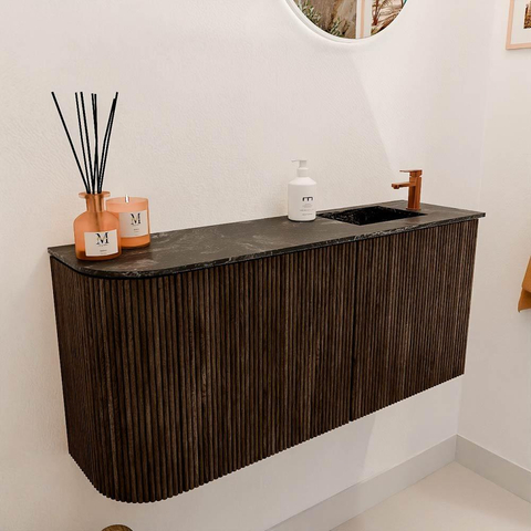 Ce meuble dégage une pure élégance grâce à l'utilisation de placage noyer chaud et à l'arrondi raffiné sur le côté gauche. Les rainures verticales dans le bois apportent une texture subtile qui confère à l'ensemble un aspect exclusif. Par son design élégant, le meuble s'intègre parfaitement aussi bien dans des salles de bains modernes que classiques. C'est un véritable point focal qui donne à votre salle de bains une touche personnelle et luxueuse, sans être trop ostentatoire. Ainsi, vous profitez chaque jour d'une salle de bains qui est non seulement belle, mais aussi invitante à la détente.