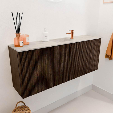 - Couleur : noyer chaud pour le meuble, Ostra pour la vasque