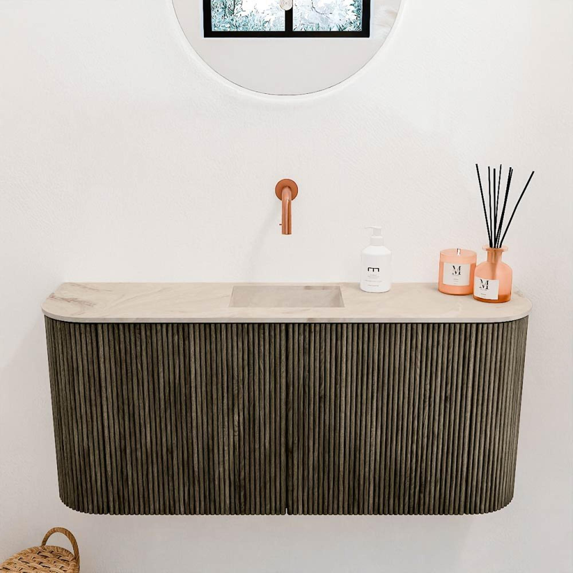 La série JOYA-DLUX est connue pour son design raffiné et sa finition de haute qualité. Ce meuble est réalisé dans une couleur profonde Shadow qui évoque une ambiance moderne et pourtant intemporelle. Les façades en chêne massif combinent chaleur naturelle et apparence épurée, tandis que les rainures verticales ajoutent subtilement profondeur et caractère. Grâce aux côtés arrondis, le meuble présente un profil unique et doux, ce qui lui confère un aspect luxueux. Vous profitez ainsi d'un meuble de salle de bains qui est non seulement fonctionnel, mais aussi un véritable point focal dans votre intérieur.