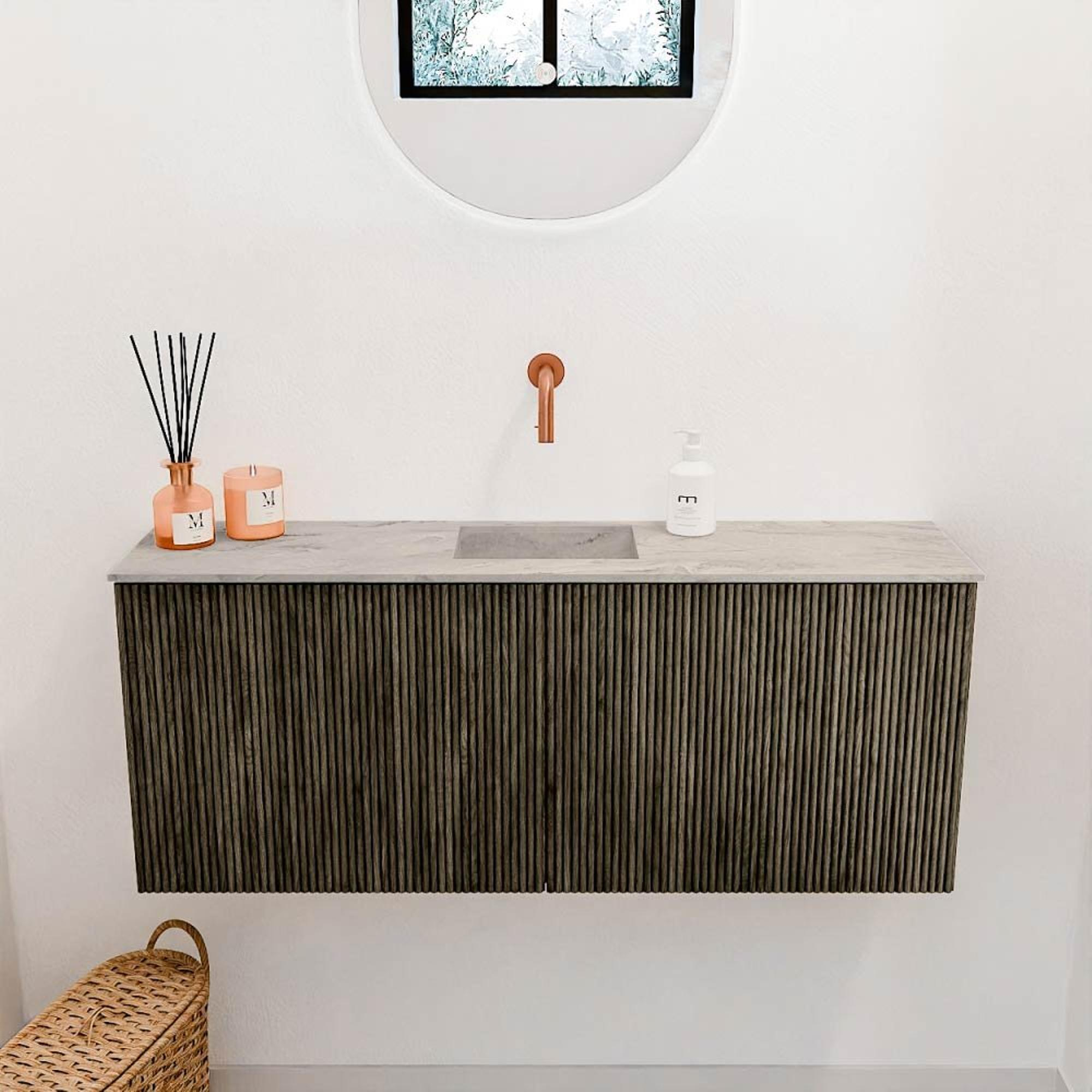 La combinaison de la couleur Shadow profonde avec la vasque claire Glace assure un aspect intemporel et élégant. Le meuble est conçu avec des rainures verticales dans le chêne, ce qui ajoute un détail subtil mais distinctif. Cela apporte non seulement du caractère, mais crée aussi une atmosphère naturelle et chaleureuse dans votre salle de bains. Grâce au design épuré et aux matériaux de haute qualité, ce meuble s'intègre sans effort dans les salles de bains modernes et classiques. Ainsi, vous profitez chaque jour d'une salle de bains qui est non seulement belle, mais reflète aussi votre style personnel.
