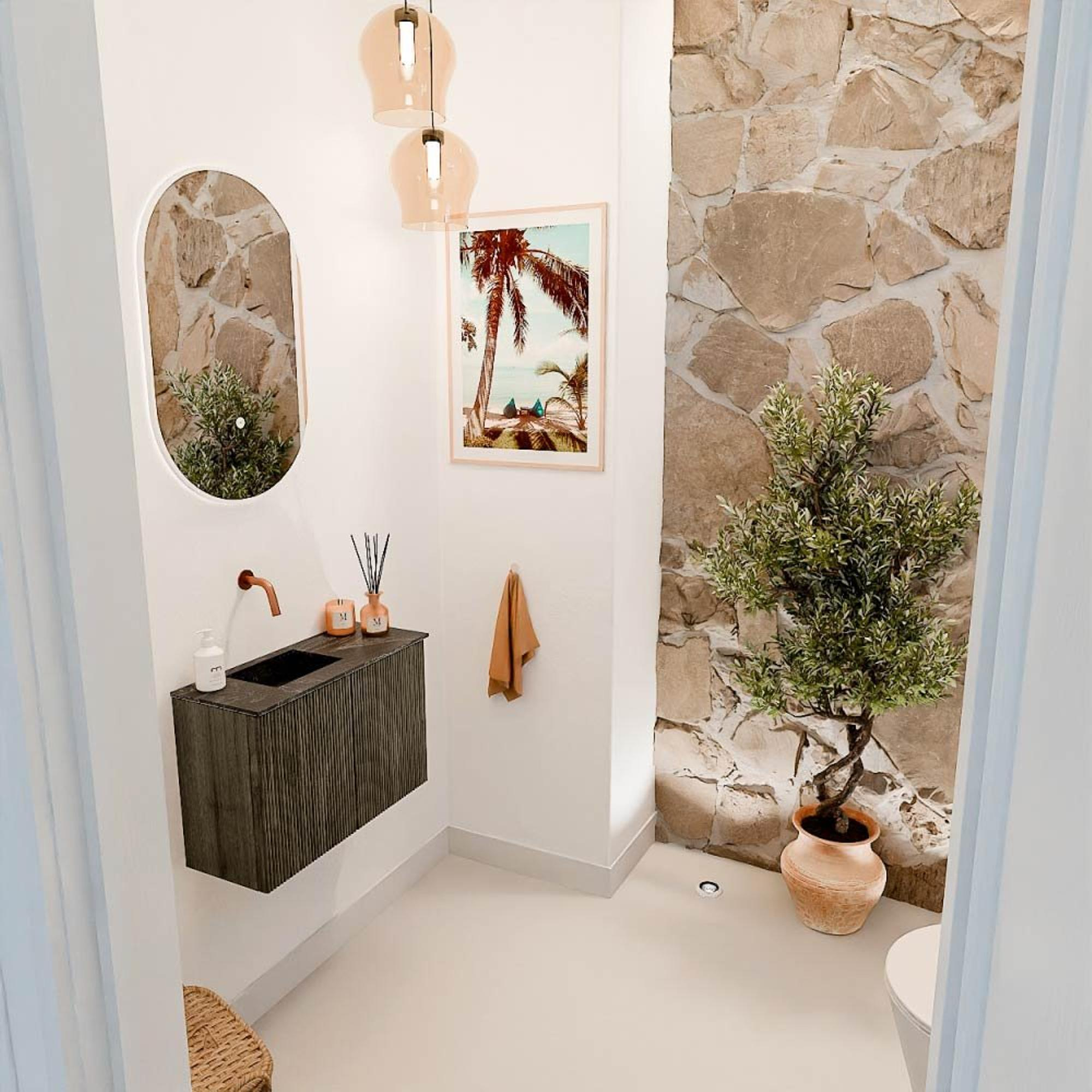Les rainures verticales dans le bois donnent au meuble un aspect contemporain et raffiné qui s'intègre parfaitement dans différents styles de salle de bains. La couleur Shadow apporte une teinte subtile et sombre qui ajoute chaleur et caractère sans dominer. Le plan vasque de couleur Lava forme un magnifique contraste et rend l'ensemble encore plus spécial. Ce meuble est un véritable point focal qui donne à votre salle de bains une apparence luxueuse et soignée, tout en restant calme et naturel.