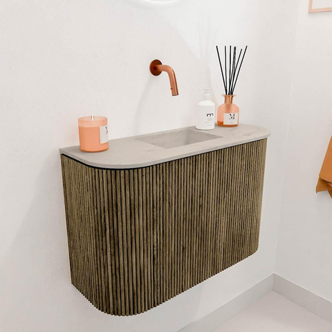 La combinaison de la couleur profonde Dusk avec le lavabo doux Opalo donne à ce meuble un aspect intemporel et pourtant contemporain. Les coins arrondis des deux côtés assurent une forme fluide et organique qui adoucit l'ensemble et s'intègre parfaitement dans les intérieurs modernes. Ce meuble est un véritable point de mire qui donne immédiatement un coup de neuf à votre espace toilettes. Grâce à son design réfléchi, il dégage non seulement du luxe, mais aussi une sensation d'accueil et de chaleur. Ainsi, vous créez un espace où vous vous sentez bien, à chaque fois.
