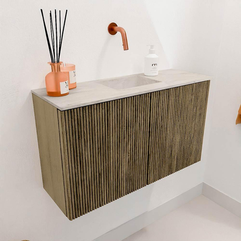 Le meuble se distingue immédiatement par ses rainures verticales élégantes et la couleur chaude Dusk qui évoque un sentiment de calme et de luxe. L'association avec la vasque Ostra au centre crée un design équilibré et moderne qui s'adapte facilement à différents styles d'intérieur. Ce meuble élégant fait de votre salle de bains un lieu dont vous êtes fier, avec une apparence à la fois intemporelle et contemporaine. Grâce au contraste subtil des couleurs et aux détails raffinés, vous créez une atmosphère harmonieuse qui invite à la détente.