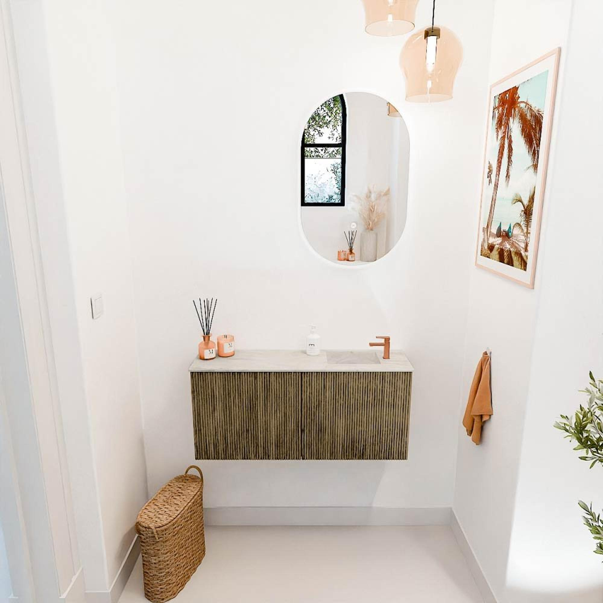 Avec ce magnifique meuble, vous donnez immédiatement à votre salle de bains ou espace toilettes un aspect élégant et naturel. Le design compact de 90 cm de large s'adapte parfaitement aux petits espaces sans sacrifier l'espace de rangement. La combinaison de façades en chêne massif avec des côtés en placage chêne dans la couleur chaude Dusk crée une ambiance intemporelle et haut de gamme. La vasque dans la couleur douce Ostra avec une position pratique du robinet à droite complète l'ensemble et le rend convivial. Grâce aux rainures verticales sur le meuble, votre espace reçoit une touche subtile et élégante qui dégage calme et classe. Ce meuble n'est pas seulement un plaisir pour les yeux, mais aussi très fonctionnel grâce à l'agencement intelligent et aux matériaux robustes qui garantissent des années de plaisir. Ainsi, vous transformez facilement votre salle de bains en un lieu où vous commencez et terminez chaque jour avec plaisir.
