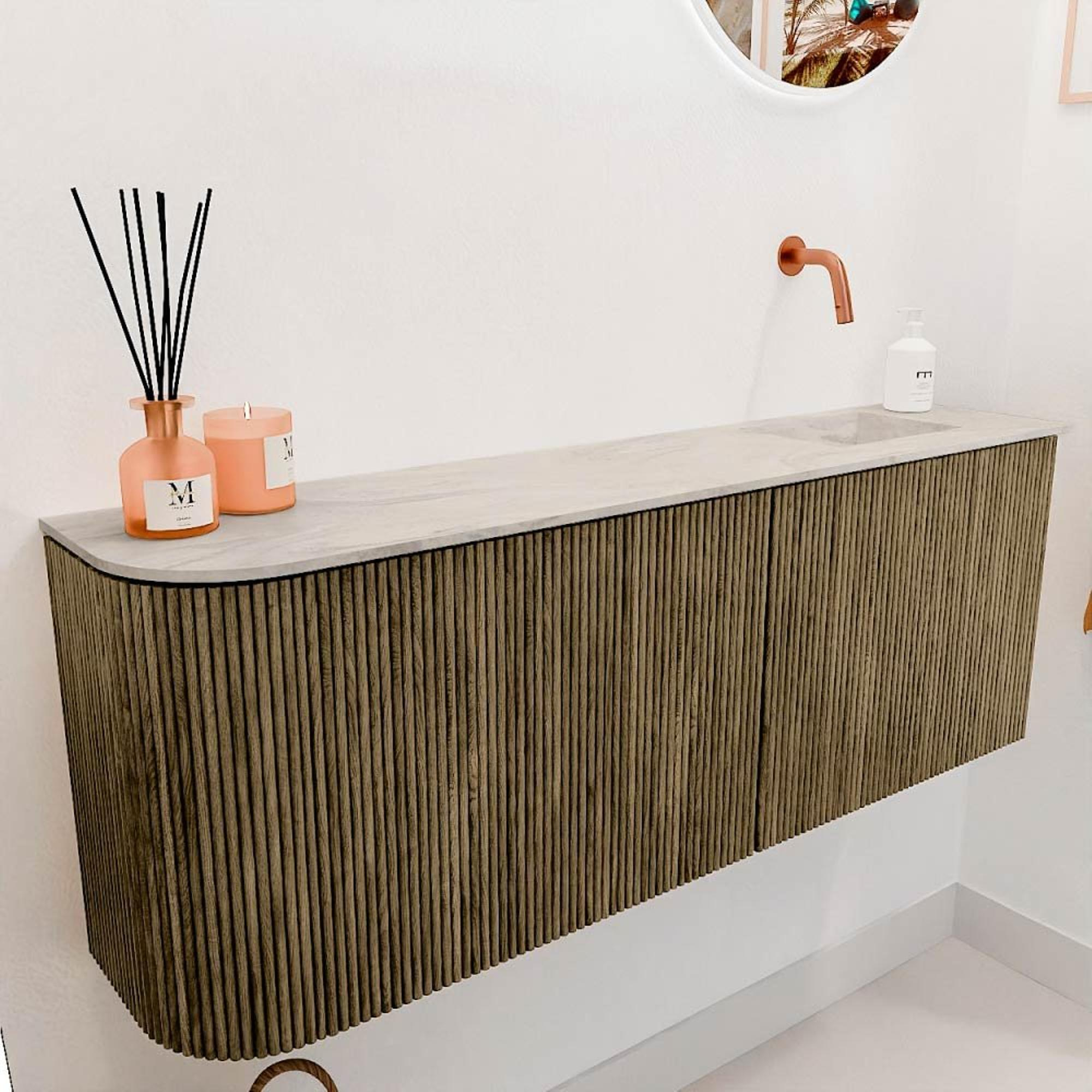 La combinaison de la couleur chaude Dusk avec l'aspect naturel du chêne massif fait de ce meuble un véritable élément phare. L'arrondi subtil sur le côté gauche assure un design unique qui se distingue des meubles de salle de bains standards. La vasque douce couleur crème Ostra crée un ensemble harmonieux qui dégage calme et élégance. Ce meuble s'intègre facilement dans différents styles d'intérieur, du moderne au rustique, et donne à votre salle de bains un aspect intemporel qui ne se démode jamais.