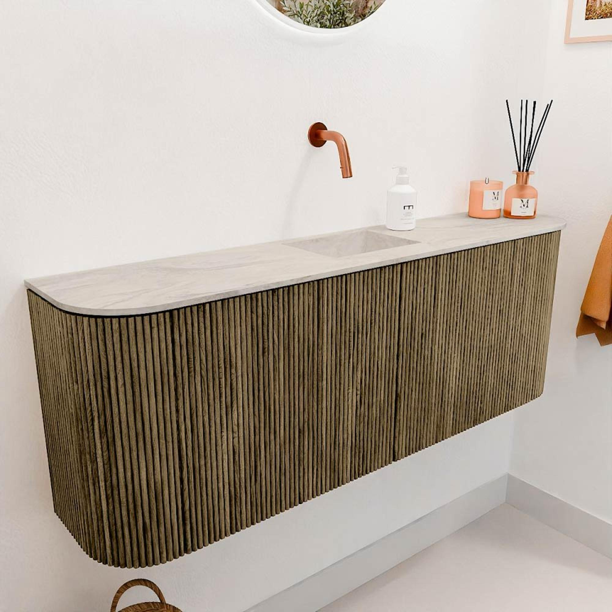 La combinaison des arrondis doux et de la couleur intemporelle Dusk fait de ce meuble un véritable point fort dans votre salle de bains. Le design dégage calme et élégance, ce qui en fait un complément parfait pour les salles de bains modernes comme classiques. Grâce à la couleur subtile et au design épuré, vous créez une atmosphère harmonieuse dans laquelle vous commencez chaque jour avec plaisir. De plus, la vasque en Ostra apporte une touche fraîche et lumineuse qui complète l'ensemble. Ce meuble est un investissement dans le style qui élève immédiatement votre salle de bains à un niveau supérieur.