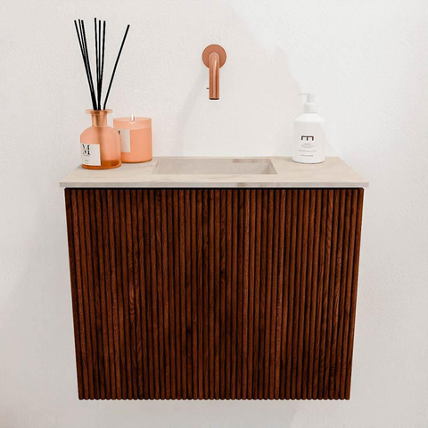 Avec ce magnifique meuble, vous donnez immédiatement à votre salle de bains ou toilettes d'invités un aspect élégant et chaleureux. Le format compact de 50 cm de large le rend idéal pour les petits espaces où vous ne voulez pas faire de compromis sur le design et la fonctionnalité. La combinaison de la couleur Ruby profonde et riche avec la vasque douce Frappe crée un contraste étonnamment élégant qui donne à votre salle de bains une ambiance luxueuse et accueillante. Grâce à la conception intelligente avec une porte et la possibilité de fixer le meuble au mur, vous créez facilement un espace de rangement supplémentaire sans prendre de place. Ainsi, vous gardez tout propre et organisé, tout en profitant d'un meuble intemporel et de haute qualité qui dure des années.